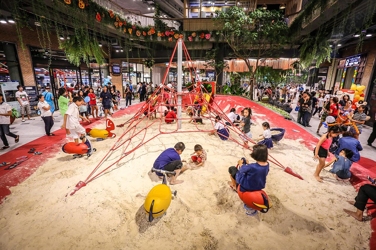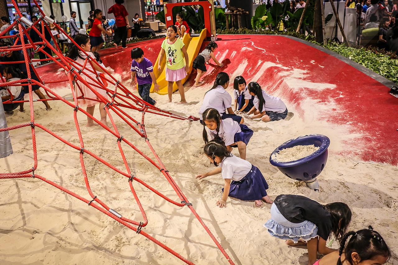 เชื่อว่าที่แรกนี้คงถูกใจเด็กๆ เป็นแน่ โดยเฉพาะการเปลี่ยนจากสนามเด็กเล่นธรรมดาแสนน่าเบื่อที่สามารถเล่นที่ไหนก็ได้ มาเป็นสนามทรายใจกลางห้างฯ ให้เด็กๆ ได้สร้างจินตนาการสนุกด้วยกัน ซึ่งไม่เพียงเด็กๆ จะเพลิดเพลินไปกับการเล่นทราย ก่อทรายเป็นรูปต่างๆ ทว่ายังมีของเล่นมากมาย อย่างสไลเดอร์ขนาดเล็ก ปีนไต่เชือก ม้านั่ง ให้เด็กๆ สนุกสนานกันอย่างไม่รู้จบด้วย โดยโซนนี้ตั้งอยู่บริเวณเอาต์ดอร์ (กลางห้างฯ) ขนาบข้างด้วยร้านอาหาร และศูนย์อาหาร เมื่อคุณทานเสร็จแล้ว หรืออยู่ในช่วงที่กำลังรออาหารเสิร์ฟ ก็อาจจะพาเด็กๆ ไปสนุกกันก่อนก็ได้ อย่างไรก็ดี โซนนี้เข้าได้เฉพาะแต่เด็กๆ เท่านั้น แต่คุณก็สามารถมองเห็น และดูแลเด็กๆ ได้อย่างใกล้ชิดตลอดเวลา !
