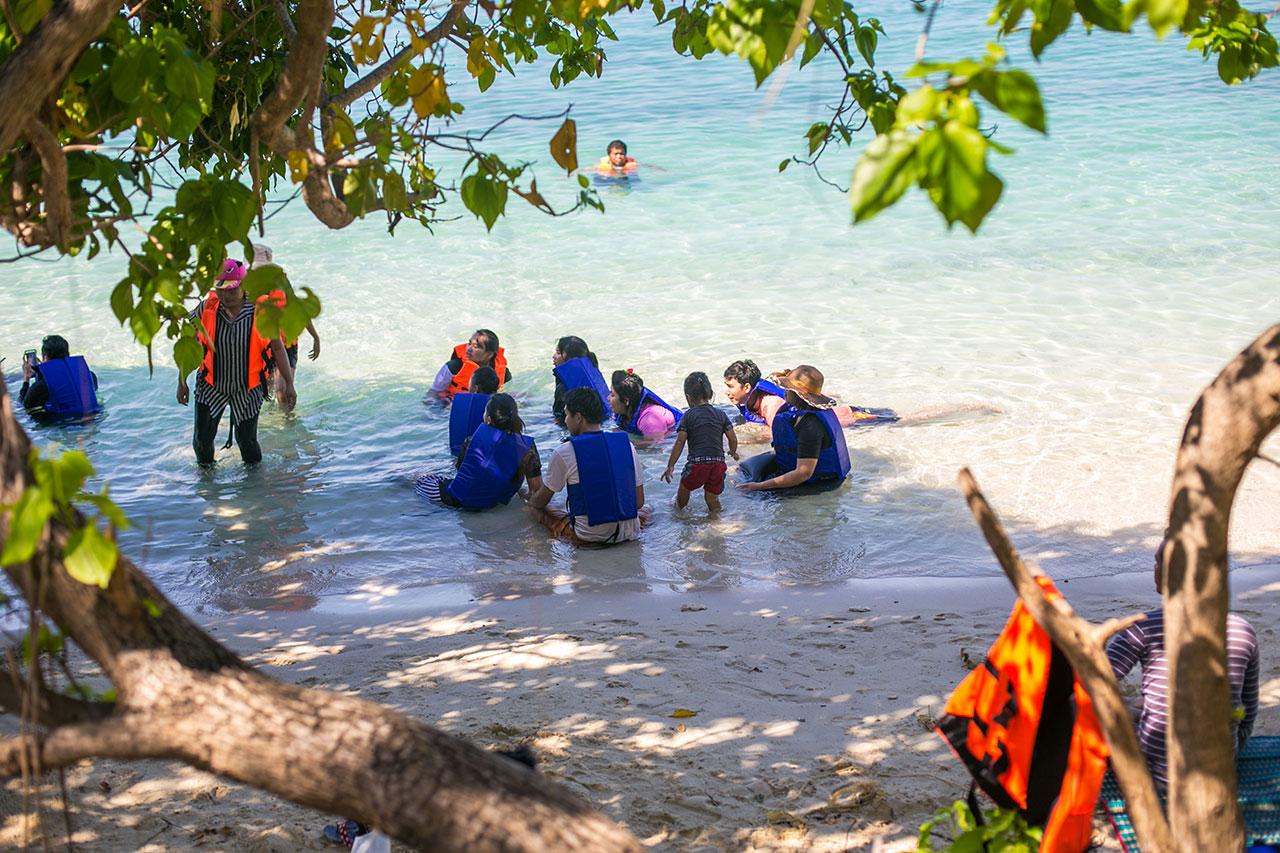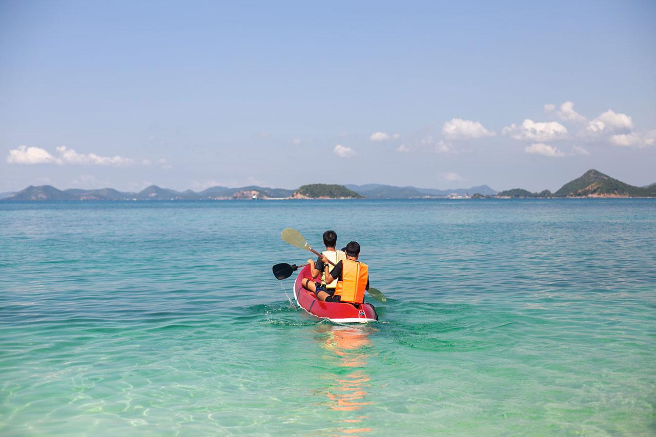 เล่นน้ำและพายเรือคายัค คืนชีวิตชีวา ชื่นฉ่ำเย็นใจ และความรื่นรมย์ไปกับการเล่นน้ำทะเลใส ส่วนใครที่ชอบออกกำลังกายก็สนุกสนานไปกับการพายเรือคายัคออกไปกลางทะเล หายใจอย่างช้าๆ รับลมและอากาศบริสุทธิ์
