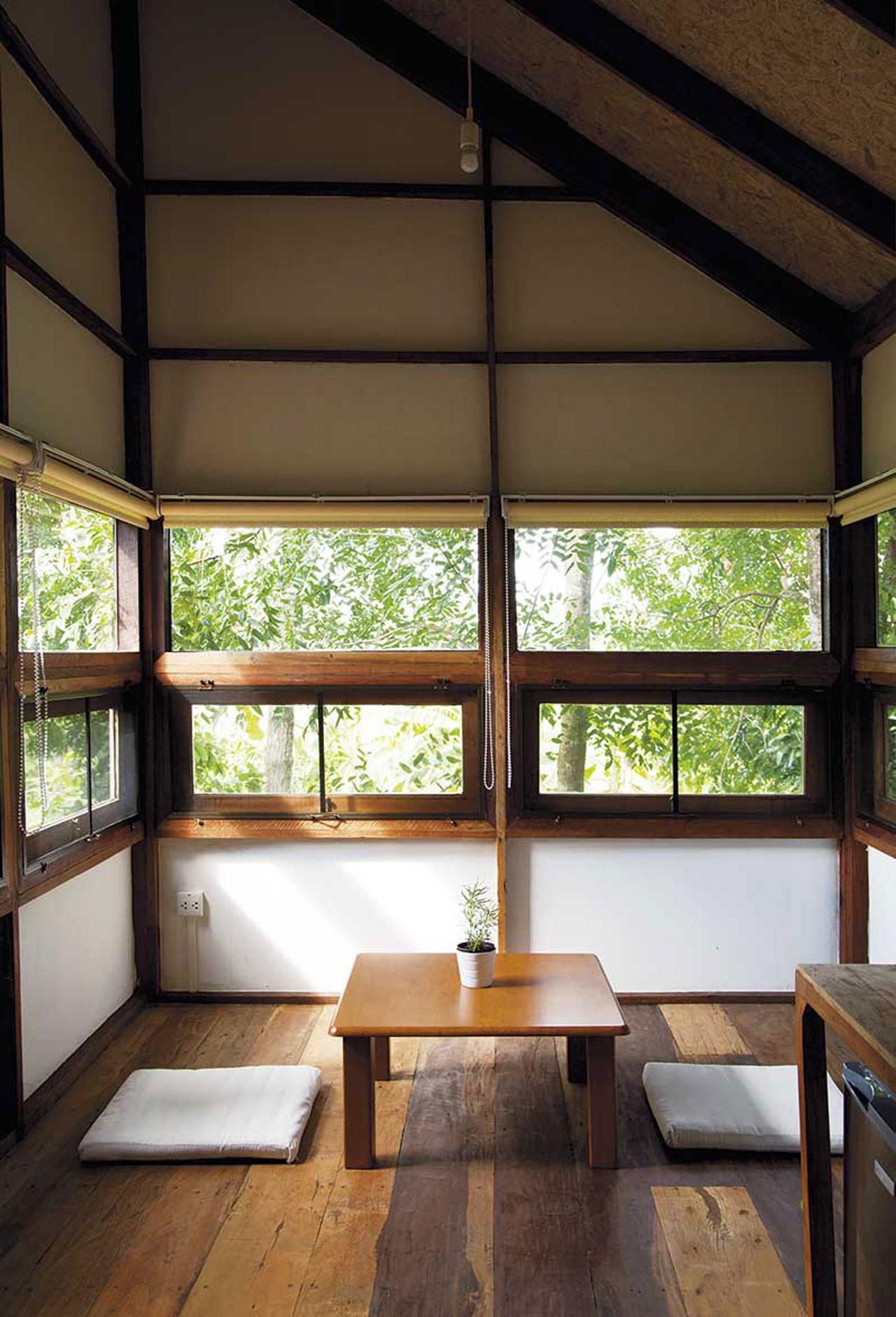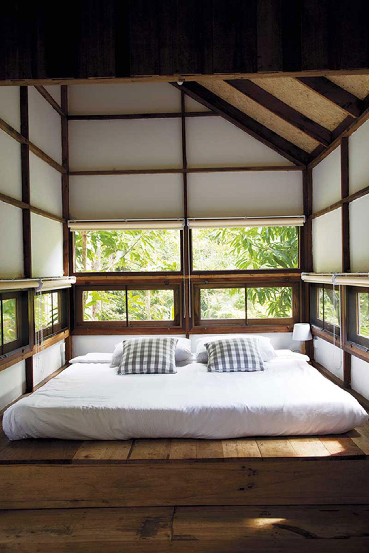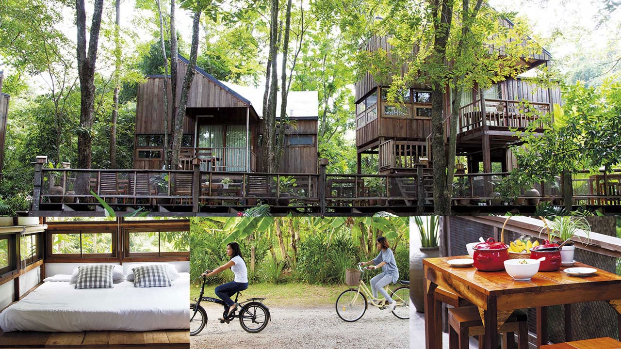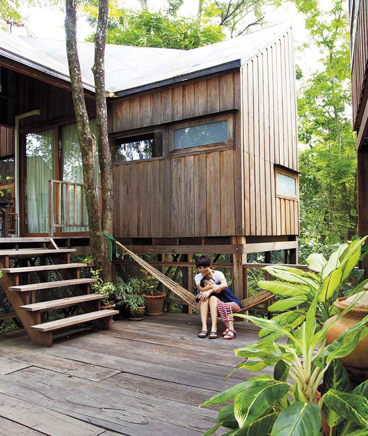 บ้านไม้รูปทรงสวยแปลกตามีต้นไม้ขนาดใหญ่ขนาบข้าง เกิดจากแนวคิดของผู้เป็นเจ้าของที่ต้องการสร้างบ้านให้อยู่ท่ามกลางต้นไม้ มิใช่ตัดต้นไม้เพื่อสร้างพื้นที่ให้บ้าน สถาปนิกผู้ออกแบบจึงต้องหลบหลีกมุม สร้างบ้านบริเวณพื้นที่ว่างเพื่อให้แมกไม้ยังเติบโตได้อย่างอิสระ ซึ่งผลลัพธ์อันคุ้มค่านอกจากรักษาต้นไม้ไว้ได้แล้ว ทั่วบริเวณบ้านยังมีร่มเงาที่ทำให้ผู้อยู่อาศัยรู้สึกเย็นสบายด้วย โฮมสเตย์ที่นี่มีเพียง 4 หลัง แต่ละหลังมีห้องน้ำในตัว ทีวี เครื่องปรับอากาศ มีไว้อย่างครบถ้วน เดินลงจากบ้านจะพบกับชานไม้ขนาดใหญ่ที่เชื่อมบ้านทั้ง 4 หลังให้เดินถึงกันได้