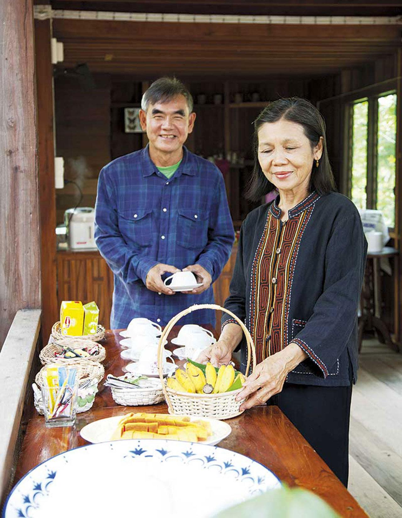 ความอิ่มเอมยังไม่หมดเพียงเท่านั้น เพราะอีกไฮไลต์ที่สำคัญคือ การได้ตื่นมามองแสงอาทิตย์ยามเช้าที่ส่องลอดต้นไม้ เป็นวิวรับอรุณที่สร้างความกระชุ่มกระชวยต้อนรับวันใหม่ได้ดีเหลือเกิน เมื่อเดินลงมาที่ชานไม้ใหญ่เราพบว่าคุณป้าจันและคุณลุงสาน กำลังง่วนอยู่กับการตระเตรียมข้าวต้มปลาเอาไว้ให้แขก แถมยังมีมะละกอและกล้วยน้ำว้าสุกที่ปลูกในสวนหลังบ้านเตรียมไว้ให้ด้วย เรานั่งรับประทานอาหารท่ามกลางแมกไม้ ความสุขสงบที่ได้พบ นอกจากจะชาร์จแบตให้กับตัวเองได้อย่างที่ตั้งใจแล้ว แนวคิดที่ว่า ‘การใช้ชีวิตอยู่ใกล้ชิดกับต้นไม้ โดยไม่คิดเปลี่ยนแปลงความงามตามธรรมชาติของมัน รวมถึงการดูแลแขกผู้มาพักเสมือนญาติ’ ที่เจ้าของโฮมสเตย์ทั้งสองท่านยึดถือนี้ ยังเป็นหลักคิดดีๆ ที่เราประทับใจ และเชื่อว่าสิ่งนี้เองที่เป็นเสน่ห์ดึงดูดใจ จนทำให้ไม่ว่าใครที่ได้มาเยือนเป็นต้องหลงรัก “บ้านสวนจันทิตา”