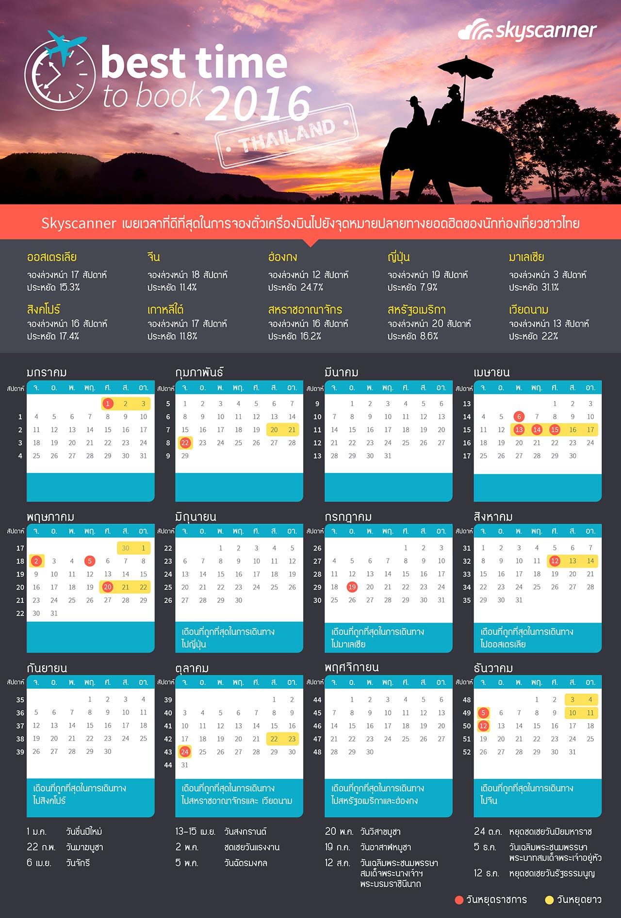 โดยสกายสแกนเนอร์ได้วิเคราะห์ข้อมูลในช่วง 3 ปีที่ผ่านมา พบว่า ช่วงเวลาที่ดีที่สุดในการจองตั๋วเครื่องบินราคาประหยัด และช่วงเวลาที่คาดว่าจะได้ตั๋วเครื่องบินราคาประหยัดที่สุด คือช่วงเดือนไหนของปี