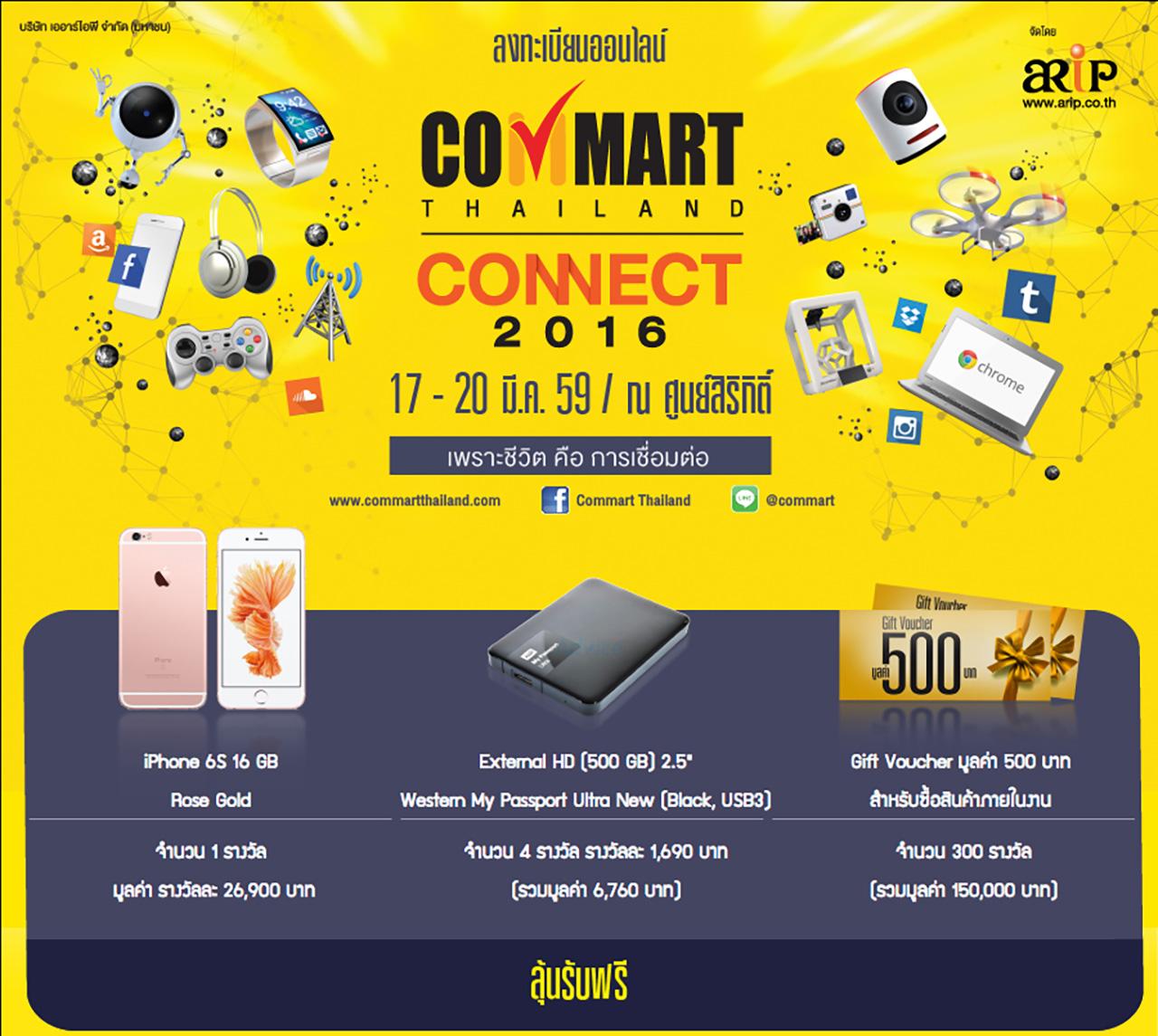 วันนี้-20 มี.ค. 2559 ชวนขาช็อปสายไอทีมาร่วมงาน "Commart Connect 2016" ณ ศูนย์การประชุมแห่งชาติสิริกิติ์ ภายในงานพบกับสินค้าไอทีมากมาย ได้แก่ โน้ตบุ๊ก อุปกรณ์ไอที โดรน กล้องโกโปร มือถือ นวัตกรรมใหม่ๆ เกี่ยวกับซอฟต์แวร์ แจกฟรีอีบุ๊ก และยังมีกิจกรรมเวิร์กช็อปให้ร่วมสนุกมากมาย แถมท้ายด้วยการลุ้นรับ Gift Voucher 500 บาท สอบถามเพิ่มเติม โทร. 0-2642-3400
