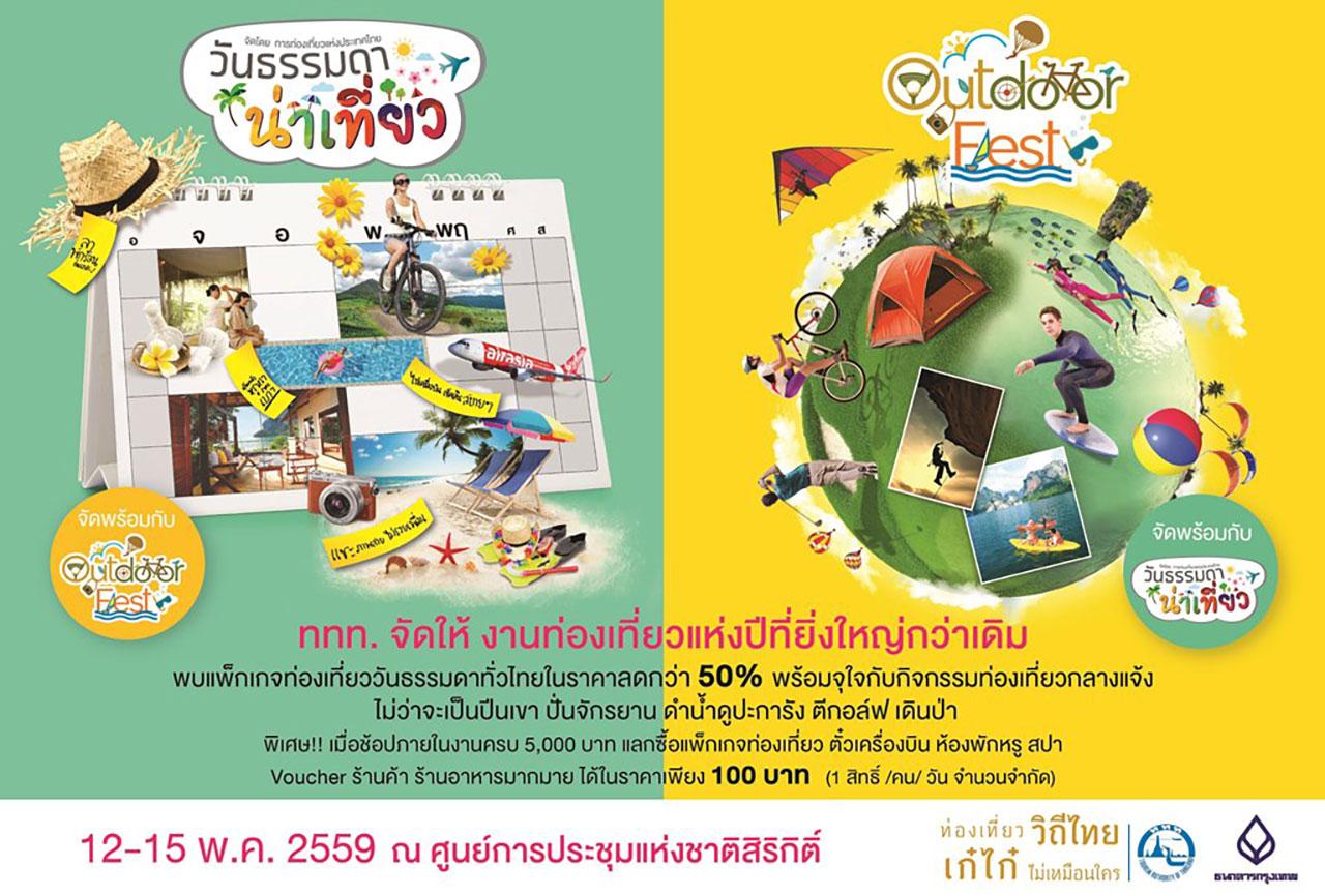 วันที่ 12 - 15 พ.ค. 2559 ชวนขาเที่ยวตบเท้าเข้าร่วมงาน "วันธรรมดา น่าเที่ยว" ซึ่งจัดขึ้นพร้อมกับงาน "Outdoor Fest" เวลา 10.00 - 20.00 น. ณ ศูนย์การประชุมแห่งชาติสิริกิติ์ ภายในงานพบกับ แพ็กเกจท่องเที่ยวดีๆ ในราคาลดกระหน่ำสุดคุ้ม และนำเสนอสถานที่ท่องเที่ยว โรงแรม ที่พักที่สะดวกสบายและมีความเป็นส่วนตัวสูง มีสถานที่ท่องเที่ยวน่าสนใจจากทั่วประเทศ