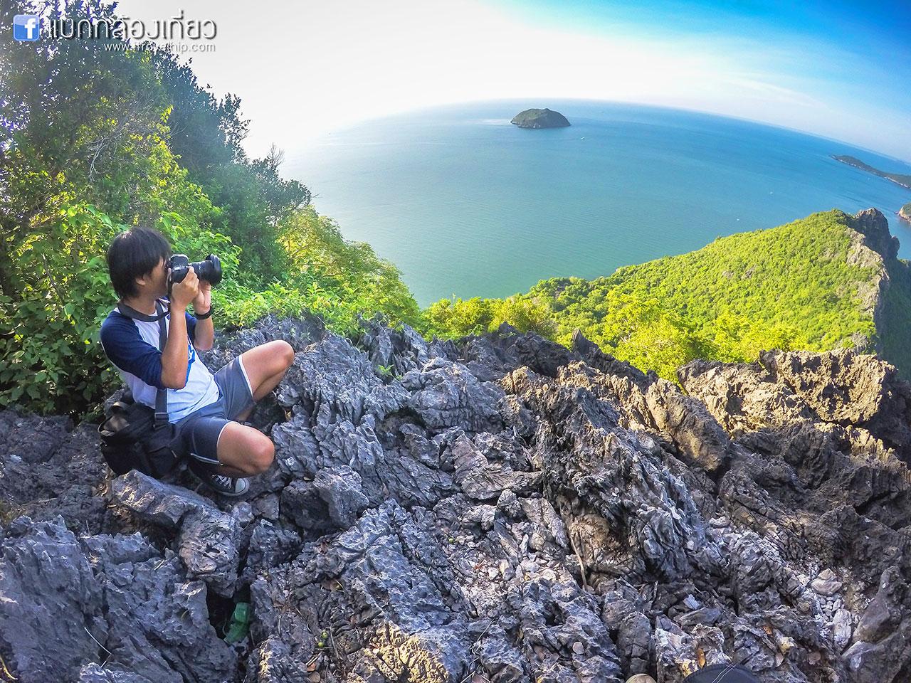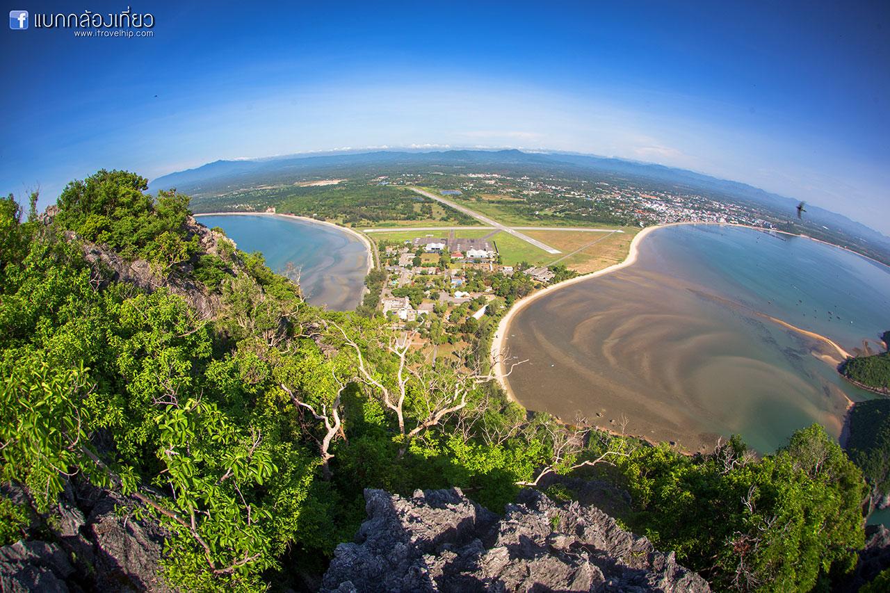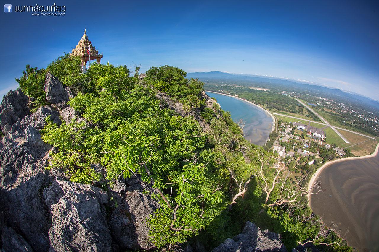 แต่พอขึ้นไปถึงขอบอกเลยว่าให้พุ่งตัวไปที่สุดผาบนยอดเขาล้อมหมวกด้านตะวันตก เรามองลงไปข้างล่างเป็นพื้นที่ของกองบิน 53 จะเห็นอ่าวมะนาวอยู่ซ้ายมือ ส่วนอีกด้านเป็นส่วนโค้งของอ่าวประจวบคีรีขันธ์ เหลือแผ่นดินคอดกิ่วกว้างไม่กี่ร้อยเมตร เป็นจุดที่สวยงามอันหนึ่งบนยอดเขานี้เลยครับ รับรองว่าคุ้มค่าเหนื่อยแน่นอน
