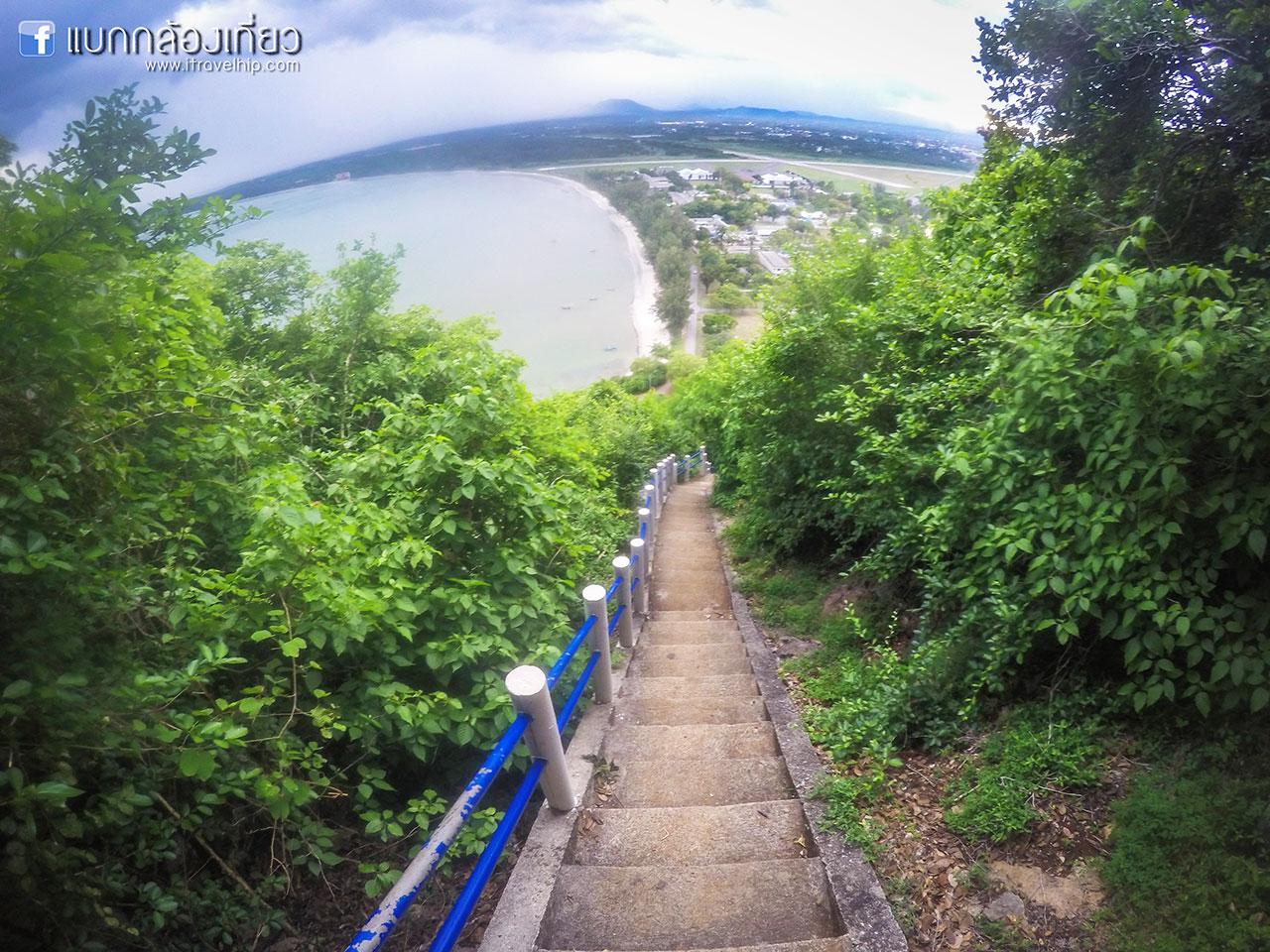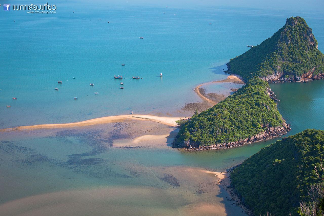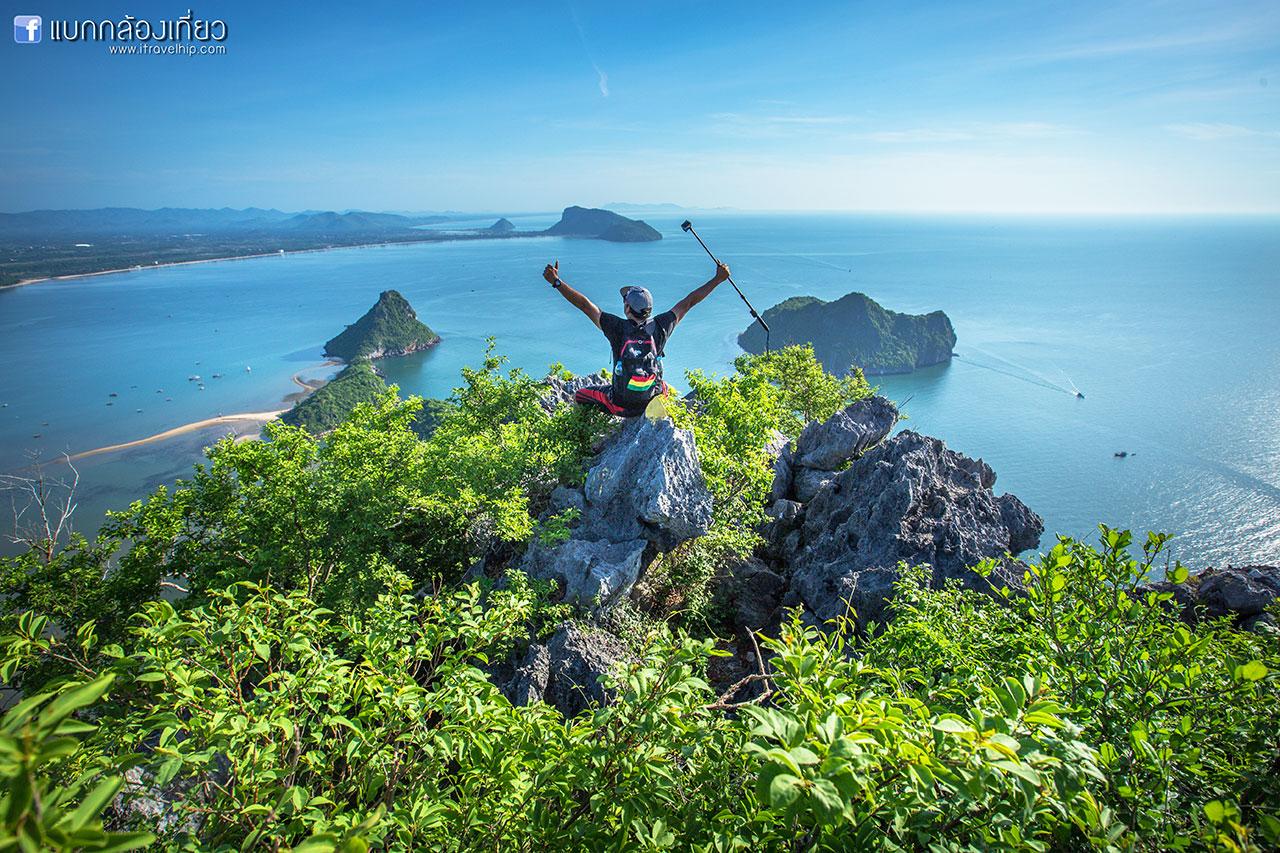 แต่พอขึ้นไปถึงขอบอกเลยว่าให้พุ่งตัวไปที่สุดผาบนยอดเขาล้อมหมวกด้านตะวันตก เรามองลงไปข้างล่างเป็นพื้นที่ของกองบิน 53 จะเห็นอ่าวมะนาวอยู่ซ้ายมือ ส่วนอีกด้านเป็นส่วนโค้งของอ่าวประจวบคีรีขันธ์ เหลือแผ่นดินคอดกิ่วกว้างไม่กี่ร้อยเมตร เป็นจุดที่สวยงามอันหนึ่งบนยอดเขานี้เลยครับ รับรองว่าคุ้มค่าเหนื่อยแน่นอน
