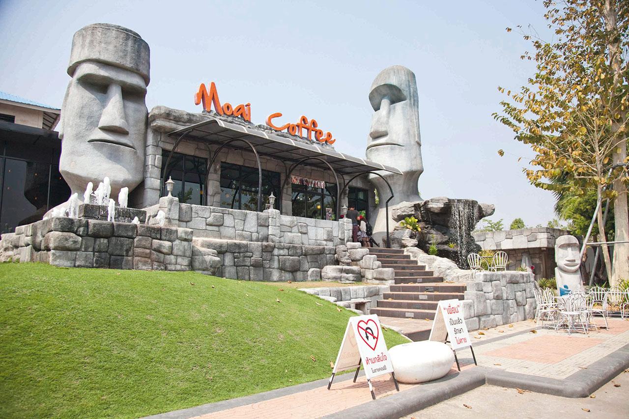 ไม่มาไม่ได้แล้ว สำหรับร้านกาแฟที่เรียกว่าฮิปสุดในสวนผึ้ง และใครมาก็ต้องถ่ายรูปกับเจ้าโมอาย แท่งหินขนาดยักษ์แกะสลักเป็นรูปหน้าคน ที่ คุณอาย เจ้าของร้านได้แรงบันดาลใจมากจากแท่งหินโมอาย มรดกโลก ที่ยืนเรียงรายกันกว่า 600 ตัว บนเกาะอีสเตอร์ อุทยานแห่งชาติลาปานุย ประเทศชิลี จุดเด่นของที่นี่อีกอย่างคื อโซนโมอายแกะ คุณสามารถเข้าไปให้อาหารน้องแกะ และถ่ายรูปเพลินๆ ได้ หรือจะเรียกความสดชื่นด้วยเครื่องดื่มในร้านที่มีให้เลือกหลายอย่าง ทั้ง กาแฟ ช็อกโกแลตปั่น ชาเขียว พร้อมด้วยของว่างอย่างเค้กหรือคุกกี้ ฉันเลือกกาแฟเย็นดื่มแล้วต้องยกนิ้วให้นะ