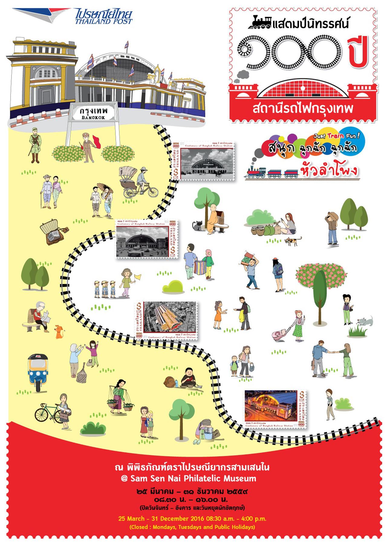 วันนี้ - 31 ธ.ค. 2559 ชวนร่วมชม "แสตมป์นิทรรศน์ 100 ปี สถานีรถไฟกรุงเทพ สนุก ฉุกฉัก ฉุกฉัก หัวลำโพง" ณ พิพิธภัณฑ์ตราไปรษณียากร สามเสนใน สถานีรถไฟฟ้าบีทีเอสสะพานควาย ในวันพุธถึงวันอาทิตย์ (ปิดวันจันทร์-วันอังคาร และวันหยุดนักขัตฤกษ์) เวลา 8.30 - 16.00 น.