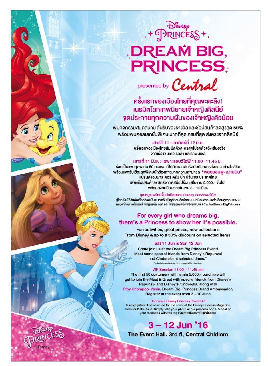 วันนี้-12 มิ.ย. 2559 ชวนเด็กๆ มาชมเจ้าหญิงผู้เลอโฉมในงาน "Central Dream Big Princess" ณ ดิ อีเวนต์ ฮอลล์ ชั้น 3 ห้างเซ็นทรัลชิดลม ภายในงานพบกับ การเนรมิตโลกเทพนิยายดิสนีย์ มีกิจกรรมมากมาย เช่น บูธซินเดอเรลลา ถ่ายรูปและตามหากุญแจเปิดกล่องรองเท้าแก้ว, บูธราพันเซล พบหอคอยราพันเซลจำลองเสมือนจริง, บูธแอเรียล กิจกรรมร้อยลูกปัด ทำเครื่องประดับให้สวยงามตามใจชอบ, การประดิษฐ์กระจกวิเศษแบบ DIY และ Fairy Face Painting จาก Central Kids Club, เปลี่ยนโฉมเด็กน้อยให้กลายเป็นเจ้าหญิงแสนสวยด้วยเวิร์กช็อปทำผมจาก Lesasha