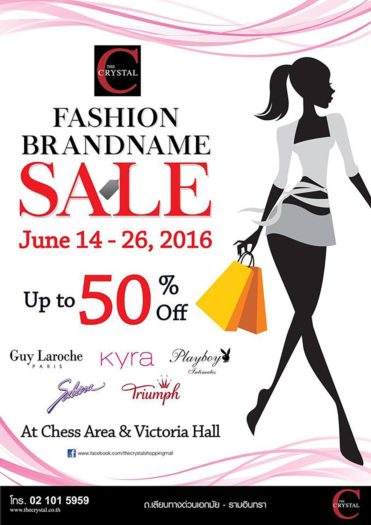 วันที่ 14-26 มิ.ย. 2559 ชวนแฟชั่นนิสต้าทั้งหลายไปช็อปในงาน "Fashion Brand Name Sale" ณ บริเวณ Chess area & Victoria Hall ที่ The Crystal เลียบทางด่วนเอกมัย-รามอินทรา ภายในงานพบกับ ขบวนสินค้าแฟชั่นแบรนด์ดัง ขนมาลดสูงสุดถึง 50% เช่น Playboy, Kyra, Sabina, Guy Laroche และ Triumph เป็นต้น และยังมีสินค้าอื่นๆ อีกมากมาย