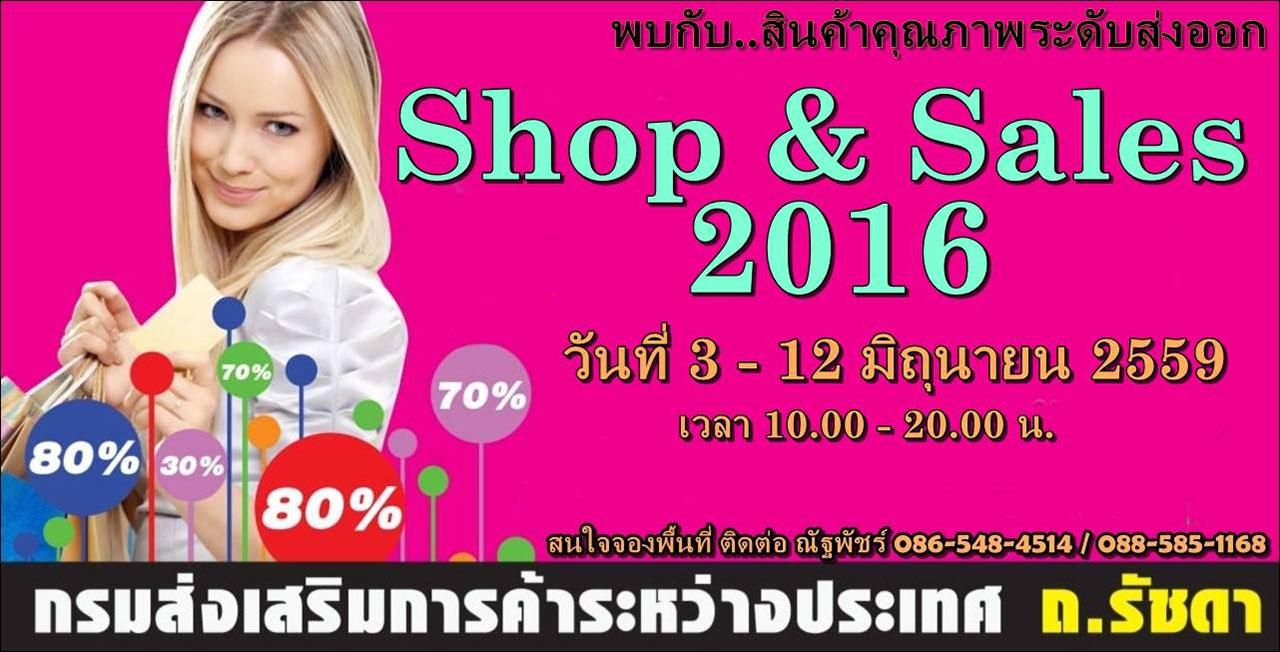 วันนี้ - 12 มิ.ย 2559 ชวนสายช็อปมาละลายทรัพย์ในงาน "Shop & Sales 2016" ณ กรมส่งเสริมการค้าระหว่างประเทศ ถนนรัชดาภิเษก ภายในงานพบกับ สินค้ามากมายคุณภาพระดับส่งออก เช่น เสื้อผ้า เครื่องสำอาง กระเป๋า รองเท้า เครื่องประดับ อัญมณี สินค้าสุขภาพและความงาม และอื่นๆ อีกมากมายในราคาสุดพิเศษ สอบถามเพิ่มเติม โทร. 08-6548-4514, 08-8585-1168