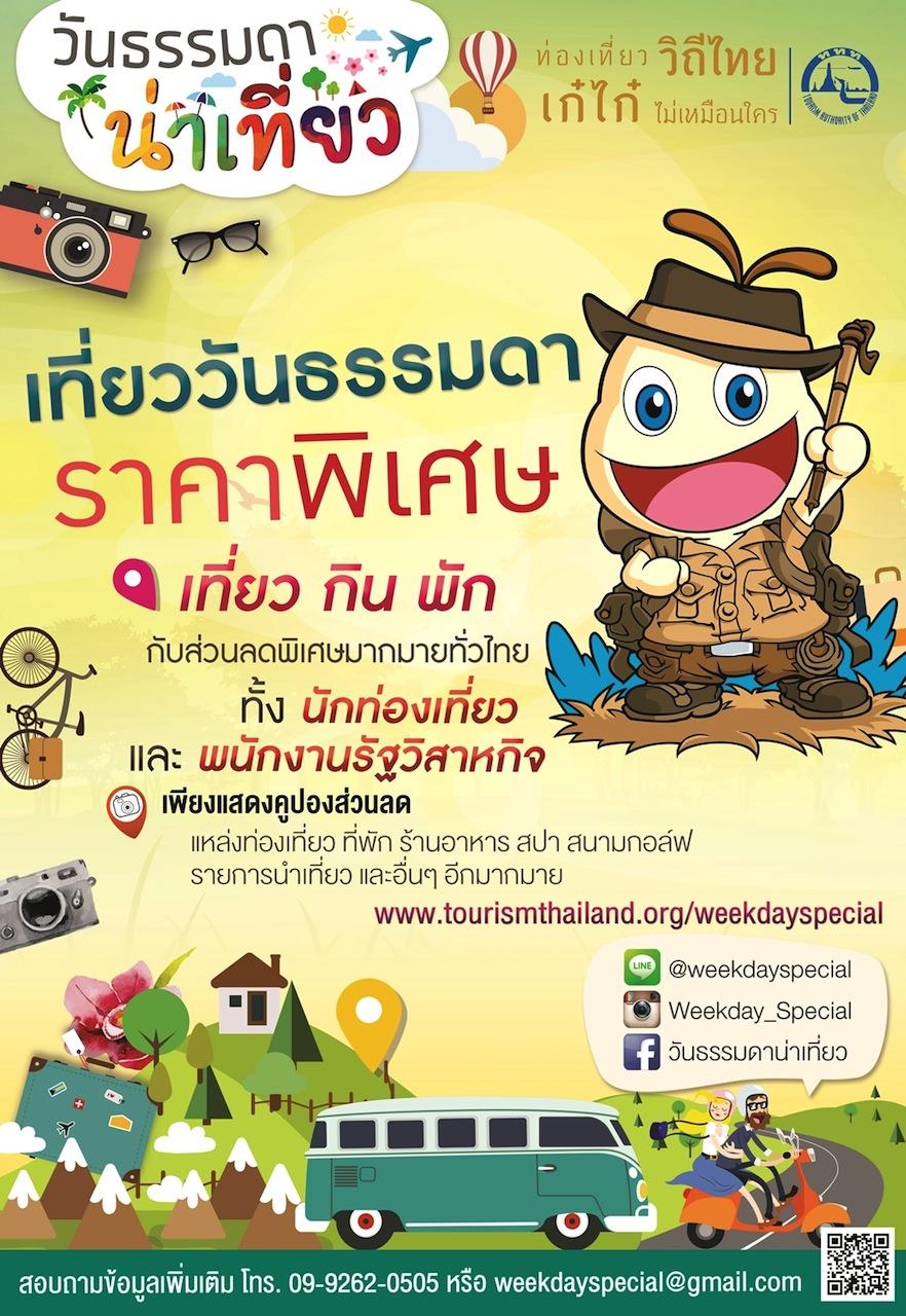 วันนี้เป็นต้นไป การท่องเที่ยวแห่งประเทศไทย (ททท.) จัดโปรโมชั่นสุดคุ้ม "วันธรรมดาน่าเที่ยว" เอาใจนักท่องเที่ยวและพนักงานรัฐวิสาหกิจ ชวนมาเที่ยว กิน พัก กับส่วนลดพิเศษมากมายจากพันธมิตรที่เข้าร่วมโครงการกว่า 200 แห่งทั่วประเทศ เช่น แหล่งท่องเที่ยว ที่พัก ร้านอาหาร รายการนำเที่ยว สามารถดาวน์โหลดคูปองส่วนลด และตรวจสอบเงื่อนไขของโปรโมชั่นต่างๆ ได้จากเว็บไซต์ www.tourismthailand.org/weekdayspecial สอบถามเพิ่มเติม โทร. 09-9262-0505 หรือ 1672
