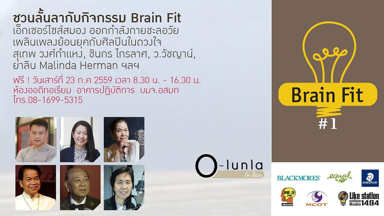วันที่ 23 ก.ค. 2559 ชวนคนไทยมาร่วมกิจกรรม "Brain Fit" ณ ห้องประชุม ออดิทอเรียม ชั้น 6 อาคารปฏิบัติการ บริษัท อสมท จำกัด (มหาชน) ภายในงานพบกับ กิจกรรมเพิ่มกำลังสมองให้ผู้สูงวัยด้วยเทคนิคการคิดด้วยภาพ สนุกสนานกับการออกกำลังกายเพื่อชะลอวัยโดยผู้เชี่ยวชาญ พร้อมเพลงเพราะๆ จากย่าลินและเมลินดา เฮอร์แมน เจ้าของคลิป 7 ล้านวิว และศิลปินอาวุโสระดับตำนาน เช่น คุณสุเทพ วงศ์กำแหง อาจารย์ชินกร ไกรลาศ อาจารย์สมพจน์ สิงห์สุวรรณ คุณ ว. วัชญาน์ เป็นต้น สอบถามเพิ่มเติม โทร. 08-1513-4971, 08-6777-6919, 08-1919-5315