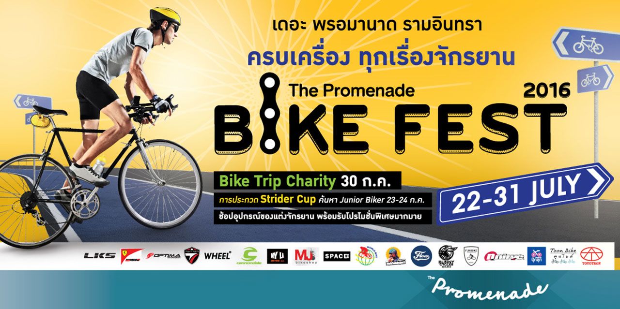 วันที่ - 31 ก.ค. 2559 ชวนสิงห์นักปั่นมาร่วมงาน "Bike Fest 2016" ณ ลานน้ำพุ ชั้น 1 เดอะ พรอมานาด ไลฟ์สไตล์ มอลล์ รามอินทรา ภายในงานพบกับ กิจกรรมการรวมตัวนักปั่นครั้งใหญ่ พร้อมพบประสบการณ์ใหม่ Bike Trip Charity ร่วมปันจักรยานเปิดเส้นทางใหม่ของเขตคันนายาว เพื่อส่งต่อรอยยิ้มให้กับเด็กๆ ผู้ขาดโอกาส ด้วยการมอบจักรยาน ให้กับโรงเรียนรัฐ และชม เชียร์ นักปั่นรุ่นจิ๋วกับการประกวด "Strider Cup"