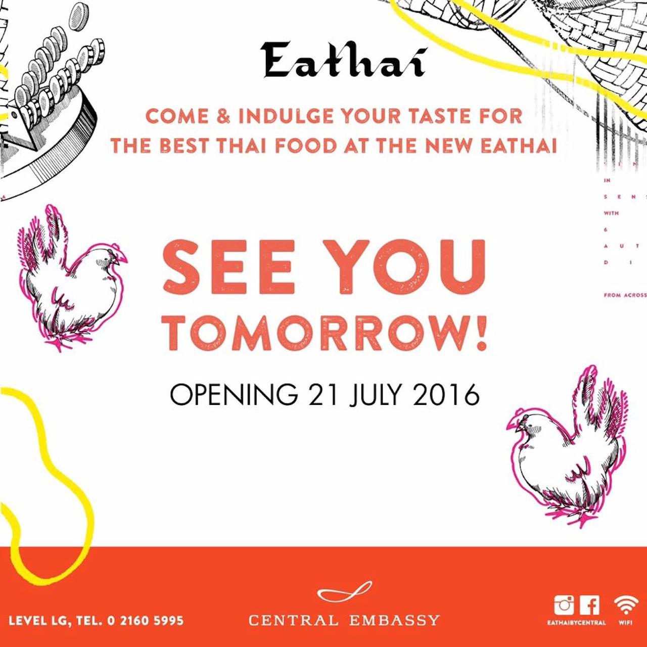 วันที่ 23 - 31 ก.ค. 2559 ชวนนักชิมไปร่วมงาน "Eathai Expansion" ณ บริเวณชั้น LG ศูนย์การค้าเซ็นทรัล เอ็มบาสซี ภายในงานพบกับ สตรีทฟู้ดเจ้าดังและอาหารไทยสี่ภาค พร้อมด้วยสินค้าและของฝากในบรรยากาศไทยร่วมสมัย จัดเต็มทั้ง 13 โซน