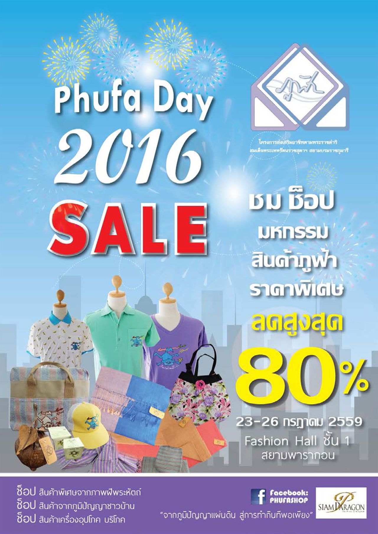 วันที่ 23 - 26 ก.ค. 2559 ชวนคนไทยไปร่วมงาน "มหกรรมภูฟ้าเดย์ 2016" ณ บริเวณ Fashion Hall ชั้น 1 สยามพารากอน ภายในงานพบกับสินค้าพิเศษจากภาพฝีพระหัตถ์ สมเด็จพระเทพรัตนราชสุดาฯ สยามบรมราชกุมารี