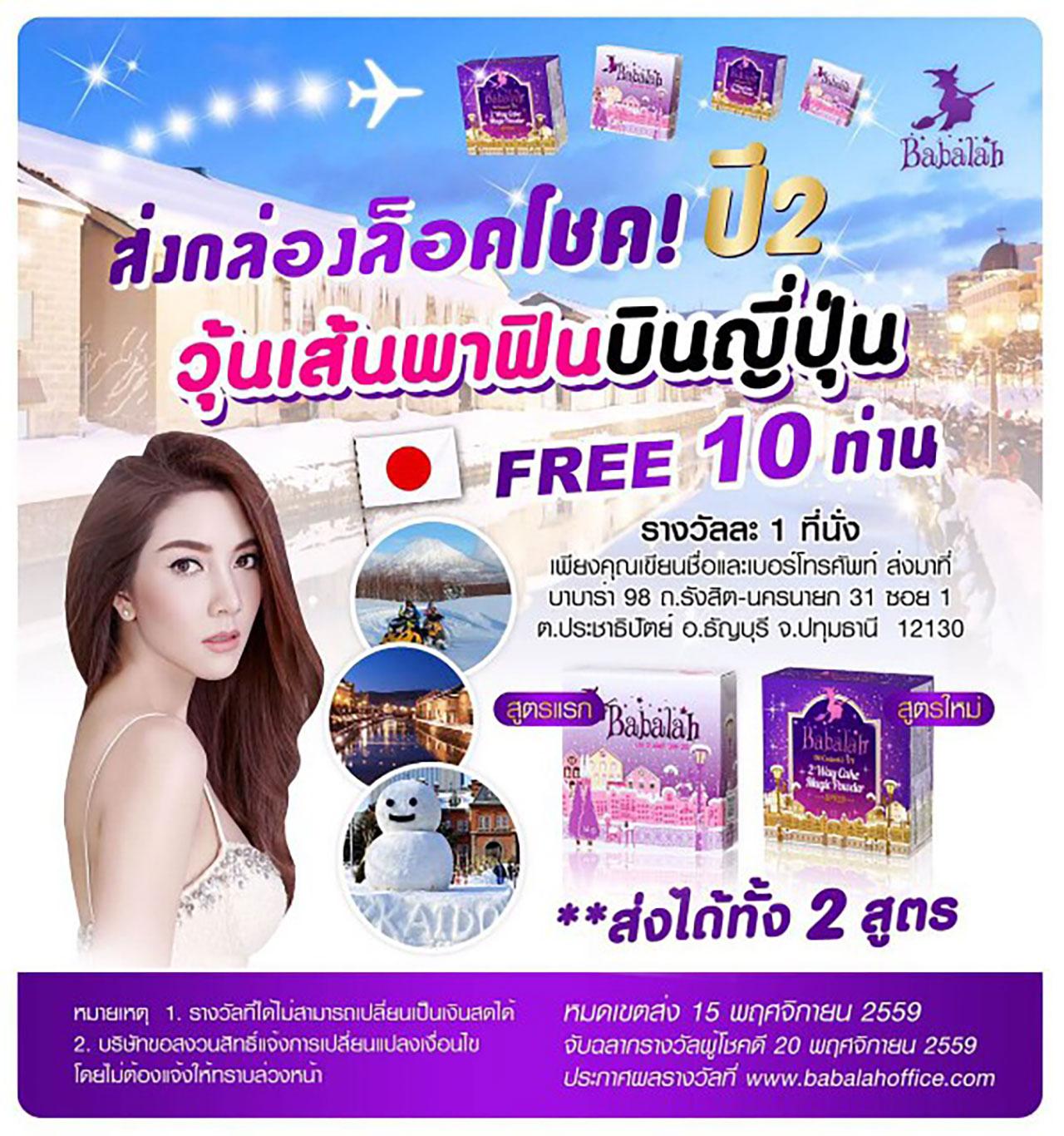 วันนี้ - 15 พ.ย. 2559 ชวนสาวกแป้งปกปิดเนียนเรียบอย่างบาบาร่า (Babalah) มาร่วมกิจกรรม "ส่งกล่องล็อกโชค! ปี 2 วุ้นเส้นพาฟินบินญี่ปุ่น" จับรางวัล 10 ท่าน ท่านละ 1 ที่นั่ง โดยมีกติกา คือ เพียงซื้อผลิตภัณฑ์บาบาร่า (Babalah) และส่งกล่องเขียนชื่อพร้อมเบอร์โทรส่งมาที่ บาบาร่า 98 ถนน รังสิต-นครนายก 31 ซอย 1 ตำบล ประชาธิปัตย์ อำเภอ ธัญญบุรี จังหวัด ปทุมธานี 12130 จับรางวัลผู้โชคดีในวันที่ 20 พฤศจิกายน 2559 พร้อมประกาศผลรางวัลรายชื่อผู้โชคดีทาง www.babalahoffice.com