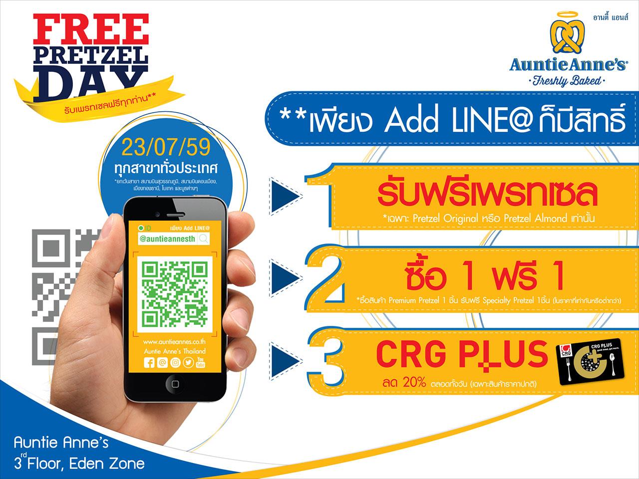 วันที่ 23 ก.ค. 2559 ชวนคนชอบทานขนมอบเพรทเซล มาอร่อยฟินกับกิจกรรม "อานตี้ แอนส์ ฟรี เพรทเซล เดย์ 2016" ณ ร้านอานตี้ แอนส์ กว่า 134 สาขาทั่วประเทศ พบกับกิจกรรมแจกเพรทเซลฟรี 2 รสชาติสุดฮิต อัลมอนด์ เพรทเซล และ ออริจินัล เพรทเซล ตั้งแต่ 11.00 - 14.00 น. เพียง Add Line@ ID:@auntieannesth
