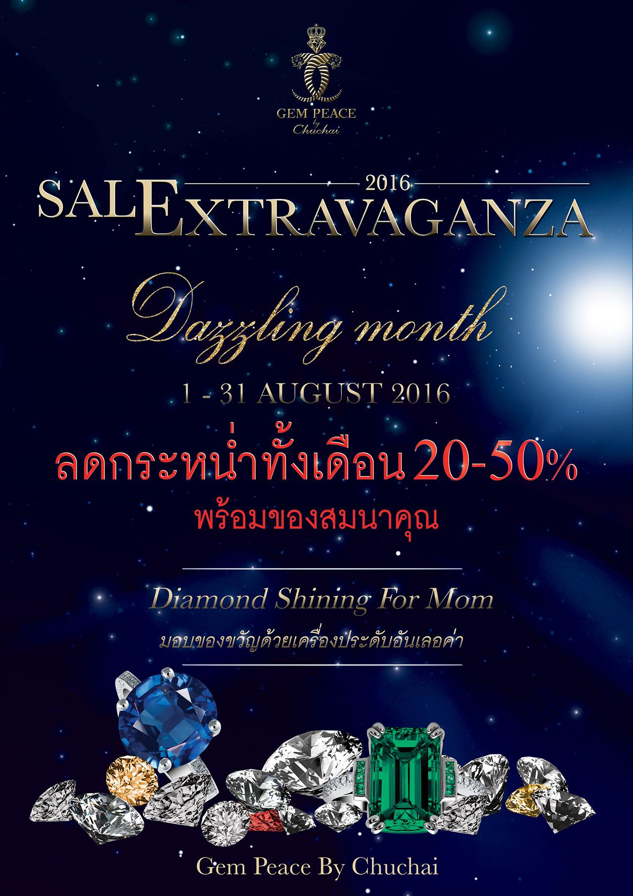 วันที่ 1-31 ส.ค. 2559 ชวนคุณลูกซื้อของขวัญวันแม่ "Sale Extravaganza 2016" ณ Gempeace by Chuchai ดิ เอ็มโพเรี่ยม ชั้น M พบกับโปรโมชั่นเด็ดแห่งปี จัดหนักลดราคาเครื่องประดับเพชร 20-50% ภายใต้ธีม Diamond Shining For Mom Gempeace by Chuchai สอบถามเพิ่มเติม โทร. 0-2664-8215