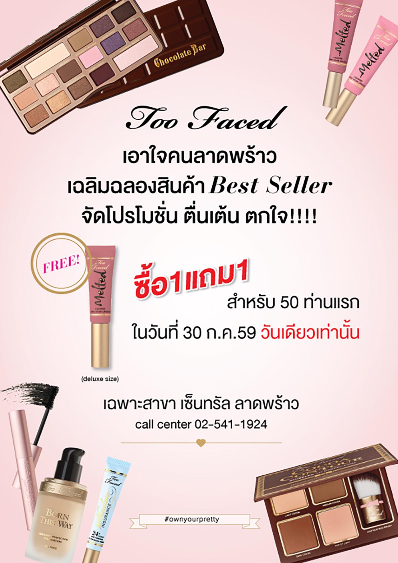 วันที่ 30 ก.ค. 2559 ชวนสาวๆ มาเพิ่มความงามขึ้นอีกระดับกับโปรโมชั่น "Too Faced ซื้อ 1 แถม 1" ณ เคาน์เตอร์ Too Faced สาขาเซ็นทรัล ลาดพร้าวเท่านั้น พบกับการเฉลิมฉลองสินค้า Best Seller จัดโปรโมชั่นตื่นตาตื่นใจ ซื้อ 1 แถม 1 สำหรับ 50 ท่านแรก รับไอเทมสุดฮิตจากแบรนด์ Too Faced หลากหลายชนิด เช่น บรอนเซอร์ อายแชโดว์ ไพรมเมอร์ ลิปสติก มาสคาร่า เป็นต้น สอบถามเพิ่มเติม โทร. 0-2541-1924