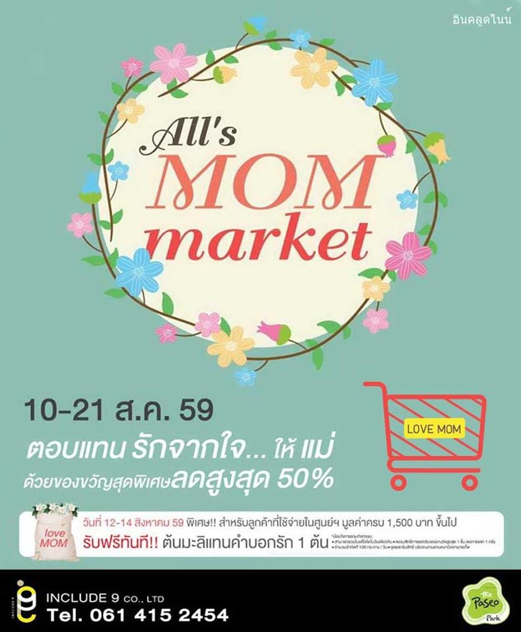 วันนี้-21 ส.ค. 2559 ชวนมาเพิ่มความสนุกทั้งครอบครัว ชวนคุณแม่ไปเที่ยวงาน "All's MoM Market" ณ เดอะพาซิโอ พาร์ก ถนนกาญจนาภิเษก ภายในงานพบกับของขวัญเพื่อคุณแม่มากมายที่ขนมาลดจัดหนักถึง 50% มีทั้งเสื้อผ้า กระเป๋า รองเท้า ของใช้ในบ้าน ของแต่งบ้าน และอื่นๆ อีกมากมาย พิเศษ เมื่อช็อปในศูนย์การค้าฯ ครบ 1,500 บาท ขึ้นไป รับฟรี ต้นมะลิแทนคำบอกรัก 1 ต้น
