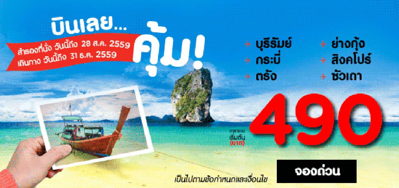 วันนี้ - 28 ส.ค. 2559 สายการบินแอร์เอเชีย ปล่อยตั๋วราคาสุดคุ้มอีกแล้วกับ "โปรโมชั่น 490 บาท" ทั้งเส้นทางบินในประเทศและต่างประเทศ เช่น กรุงเทพฯ สู่ บุรีรัมย์ กระบี่ ตรัง ย่างกุ้ง สิงคโปร์ ซัวเถา เป็นต้น สำรองที่นั่งได้แล้ววันนี้ - 28 ส.ค. 2559 เพื่อเดินทางได้ตั้งแต่วันนี้ - 31 ธ.ค. 2559