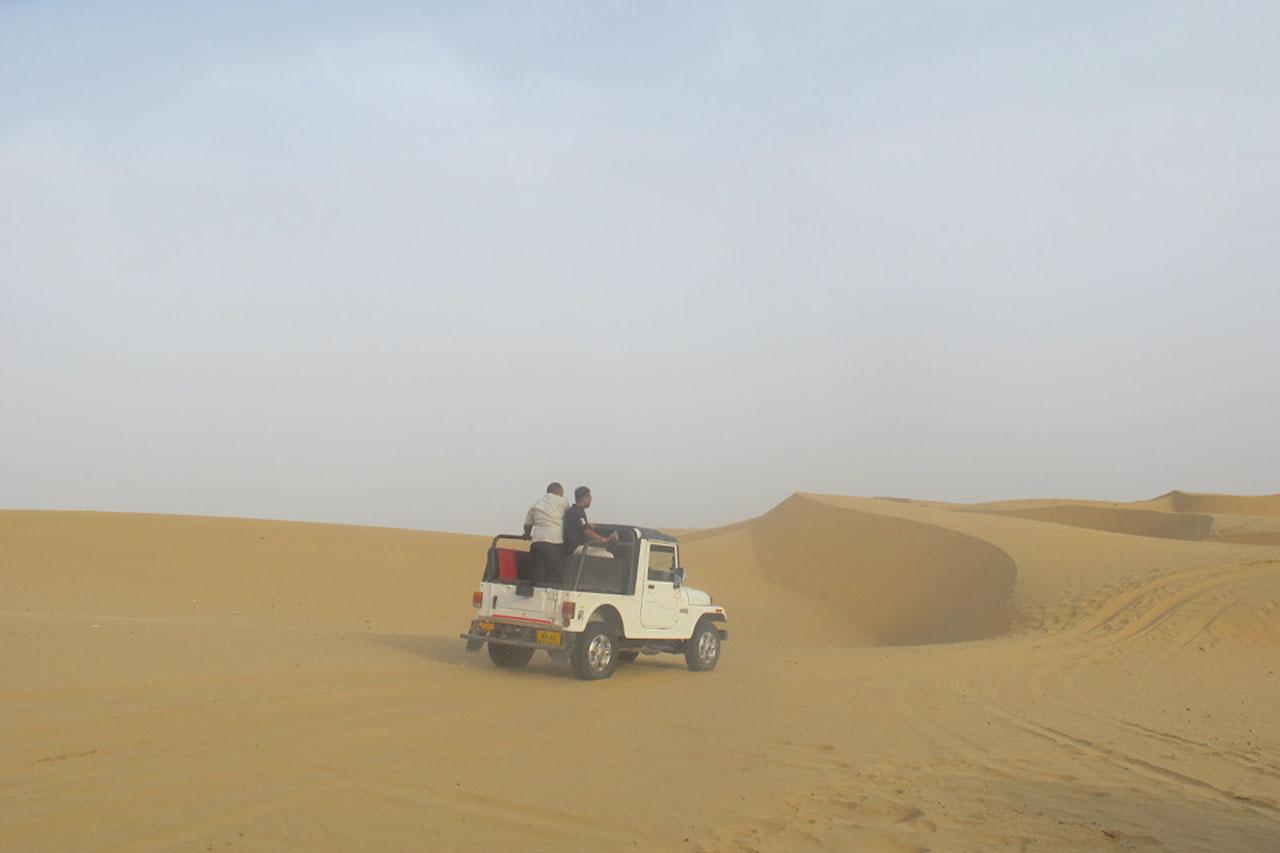 เราเดินไปที่จุดนำเที่ยว คนขับรถแท็กซี่ของโรงแรมและเจ้าของทัวร์ได้เชิญชวนให้เรานั่งรถจี๊ปซิ่งข้ามทะเลทรายเพื่อเข้าไปยังจุดขี่อูฐโดยต้องเสียค่าใช้จ่ายเพิ่ม เราเลยทักท้วงว่า อ้าวเฮ้ย ไม่เหมือนที่คุยกันไว้นี่หน่า เพราะว่าตอนจ่ายเงินค่าทัวร์ที่โรงแรม พนักงานเขาบอกว่ารวมทุกอย่างเสร็จสรรพแล้วไม่ต้องจ่ายเพิ่ม แต่สุดท้ายเราก็ตกลงกันว่ายอมจ่ายก็ได้ เพราะที่นี่มันจัยซัลแมร์นะเว้ยไม่ใช่สมุทรปราการ จะได้มีโอกาสมาได้บ่อยๆ