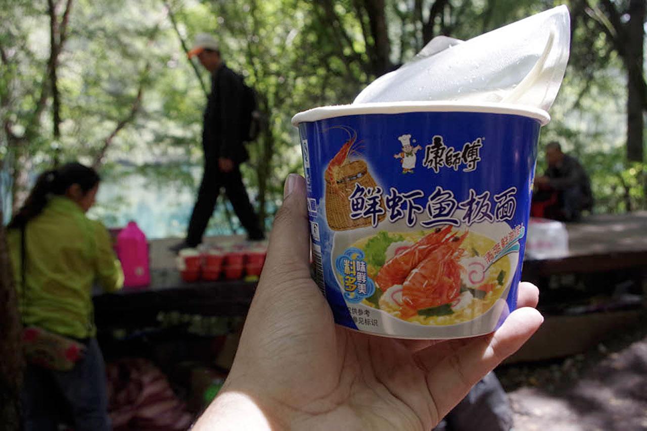 เวลาลุล่วงมาหลังเที่ยง และอาหารที่อยู่ในท้องเรามีแค่แอปเปิล 1 ลูกซึ่งสลายไปนานแล้ว โชคดีที่ระหว่างทางมีแม่ค้าวางขายมาม่าแบบแบกับดิน แม้ราคาจะพุ่งไปถึงถ้วยละ 15 หยวน (ประมาณ 80 บาท จากราคาปกติ 3.5 หยวน) แต่เราก็ยอมจ่ายโดยดี มาม่าจีนต่างจากมาม่าไทยตรงที่ถ้วยใหญ่ เส้นบวมอืดกว่า เรียกได้ว่ากว่าจะกินหมดถ้วยก็เล่นเอาเรานั่งอืดจนไม่อยากเที่ยวต่อ