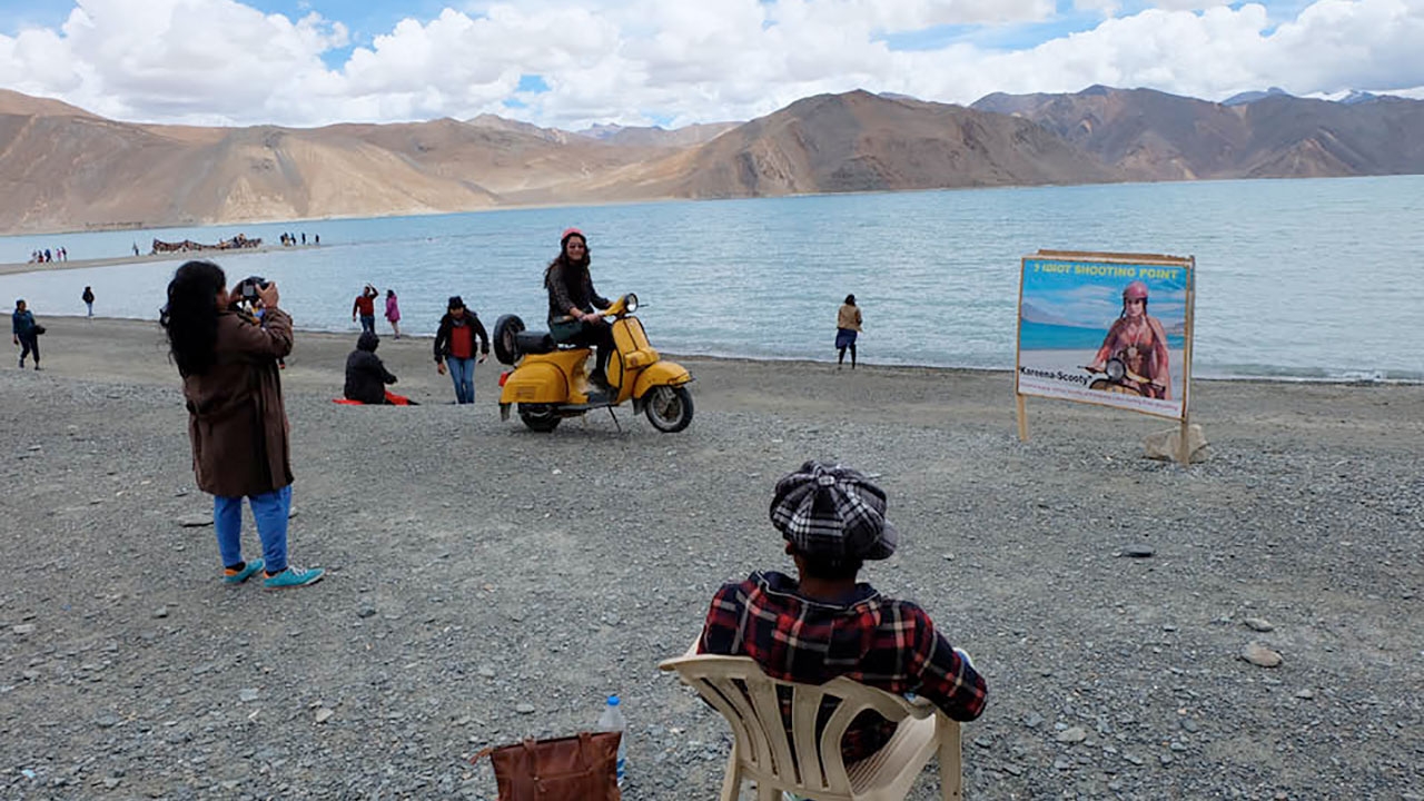 สังเกตได้ว่าบริเวณรอบทะเลสาบทั้งในโรงแรมและร้านอาหารนั้นเต็มไปด้วยภาพจาก 3 Idiots หนังอินเดียแนวตลกสุดฮิตที่มีเนื้อหาสะท้อนเรื่องการศึกษา โดยผู้กำกับคนเดียวกับเรื่อง PK (ผมเคยดูแล้วชอบมาก ขอเชิญผู้สนใจไปหาชมกันได้ เคยเห็นมีแผ่นขายที่ร้านลิโด้ดีวีดี) ซึ่งฉากเด่นของหนังอยู่ในตอนที่นางเอกขี่สกู๊ตเตอร์สีเหลืองริมทะเลสาบปันกอง ทำให้ที่นี่โด่งดังเป็นพลุแตก มีคนมาเที่ยวตามรอยหนังมากมาย ผลก็คือมีรูปจากหนังเรื่องนี้อยู่รอบทะเลสาบเต็มไปหมด แถมตรงด้านหน้ายังมีสกู๊ตเตอร์สีเหลืองแบบเดียวกับในหนังจอดไว้ให้คนเช่าถ่ายรูป ซึ่งพอเห็นแล้วก็เกิดรู้สึกขัดๆ ที่เวลาเที่ยวธรรมชาติแต่กลับเจอภาพเหล่านี้ (แต่ยังไม่พีคเท่าตอนที่ผมไปอุทยานอู่หลงในจีน แล้วอยู่ดีๆ มีหุ่นยักษ์จากหนัง Transformers โผล่ขึ้นมากลางป่า ซึ่งเป็นสถานที่ถ่ายทำหนังซะอย่างนั้น เล่นเอาอารมณ์ดื่มด่ำธรรมชาติลดลงไป 50%)
