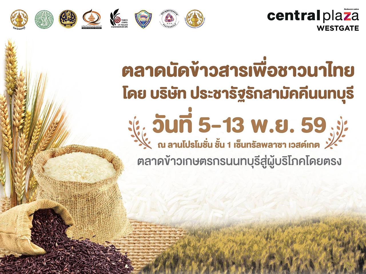 วันนี้-13 พ.ย. 2559 ชวนคนไทยช่วยชาวนา โดยไปร่วมงาน “ตลาดนัดข้าวสารเพื่อชาวนาไทย” ณ ลานโปรโมชั่น ชั้น 1 หน้าร้าน Jaspal ศูนย์การค้าเซ็นทรัลพลาซา เวสต์เกต ภายในงานพบกับ การตั้งบูธขายข้าวจากชาวนาไทยตรงสู่มือผู้บริโภค โดยมีสินค้าคุณภาพมากมาย และยังได้ช่วยเหลือชาวนาให้ผ่านวิกฤติราคาข้าวตก และผู้บริโภคก็ได้ข้าวคุณภาพดีในราคาย่อมเยา
