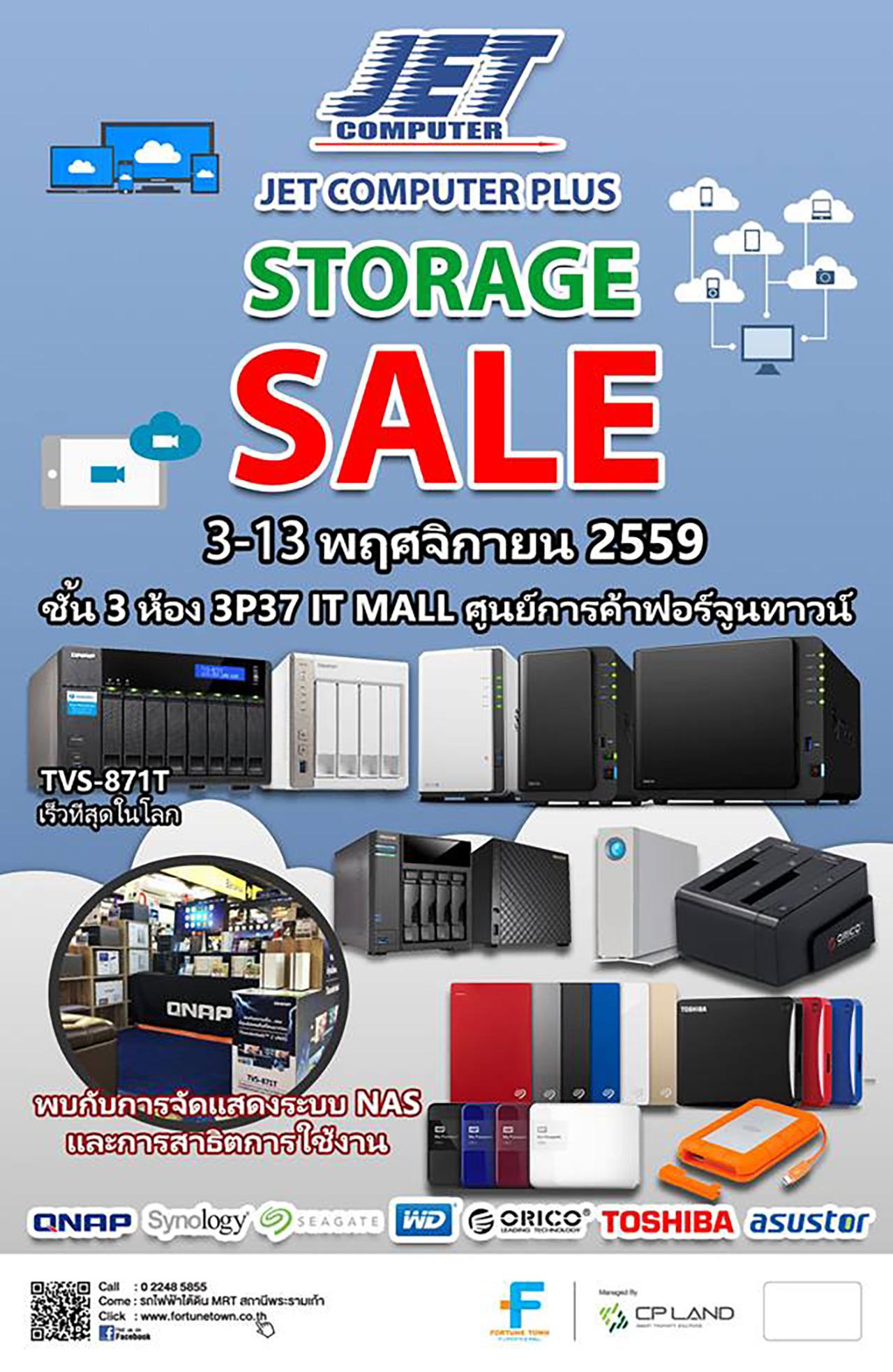 วันนี้-13 พ.ย. 2559 ชวนชาวไอทีมาช็อปสินค้าไอทีสุดล้ำในงาน JET COMPUTER PLUS "STORAGE SALE" ณ ชั้น 3 ห้ัอง 3P37 IT MALL ศูนย์การค้าฟอร์จูนทาวน์ ภายในงานพบกับสินค้าไอทีลดราคาสุดกระชากใจ เช่น คอมพิวเตอร์ RAM NAS ตัวสำรองข้อมูลต่างๆ