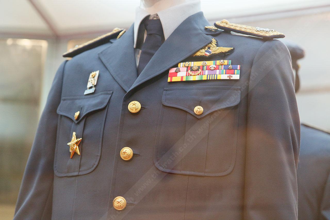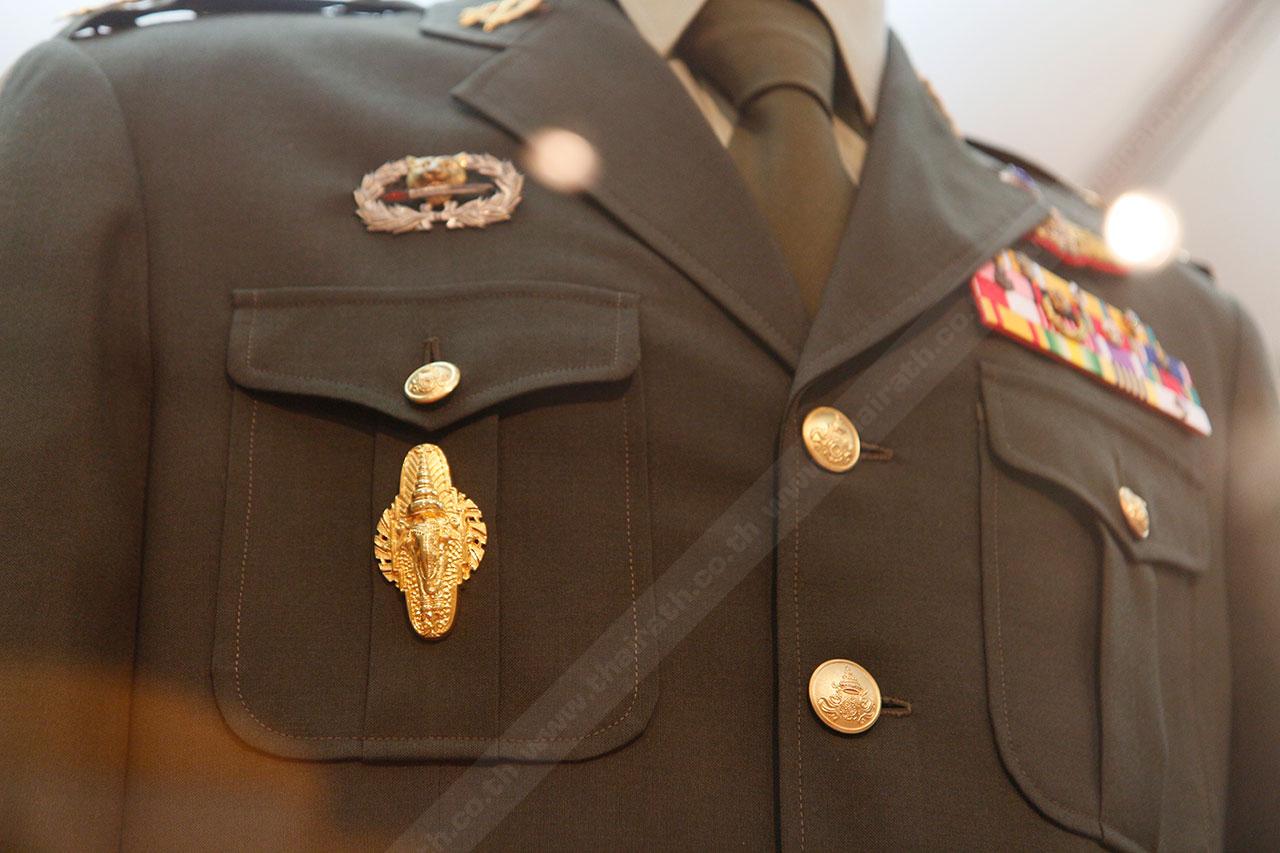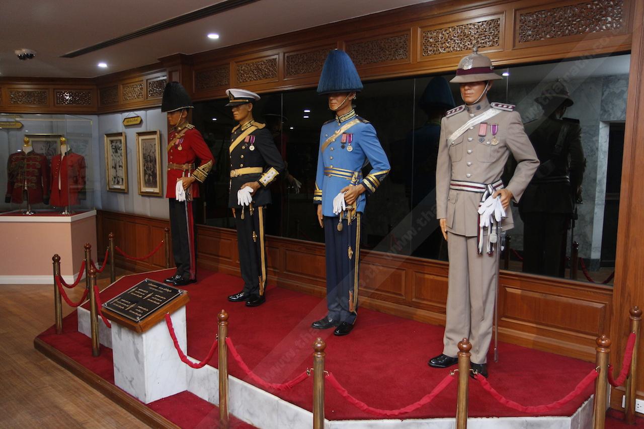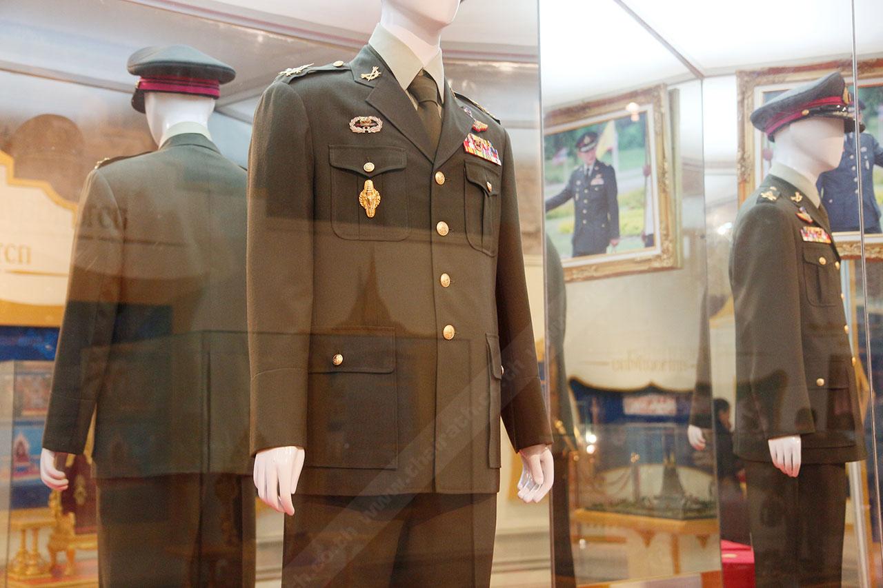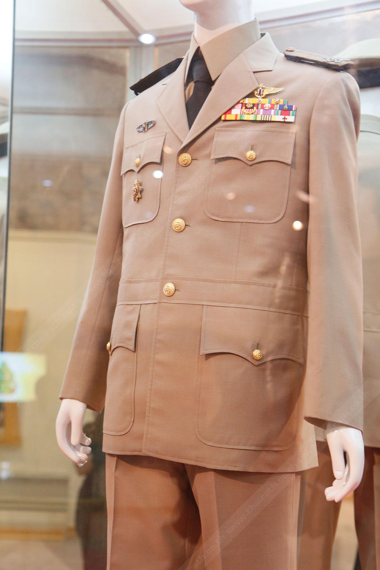 พันเอกเอกศักดิ์ เล่าว่า ชุดที่นำมาจัดแสดงเรียกว่า เครื่องแบบทหารบก เครื่องแบบเรือ เครื่องแบบอากาศ โดยมีเสื้อชั้นนอกแบบคอแบะ ลักษณะเป็นคอปกเหมือนเสื้อสูท ส่วนสีเสื้อก็จะแบ่งสีตามเหล่าทัพ ทัพบกสีเขียว ทัพอากาศสีน้ำเงิน ส่วนทัพเรือสีกากี แต่ถ้าเป็นชุดเต็มยศจะเป็นอีกแบบหนึ่ง ซึ่งเสื้อนอกจะเป็นสีขาว คอปิด แขนยาว มีกระเป๋าเสื้อสองข้าง กระเป๋ามีปก ประดับเครื่องราชอิสริยาภรณ์ตามที่ได้รับพระราชทาน