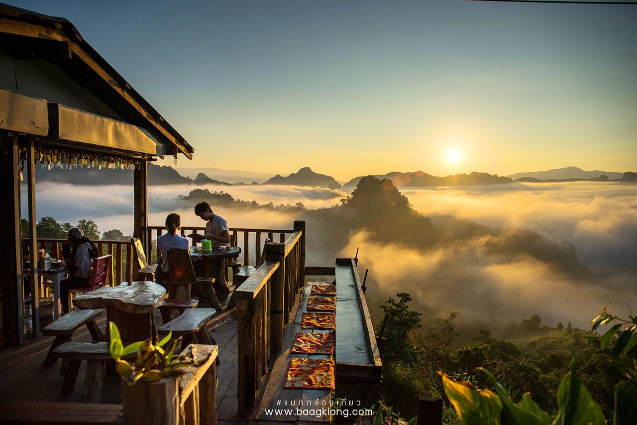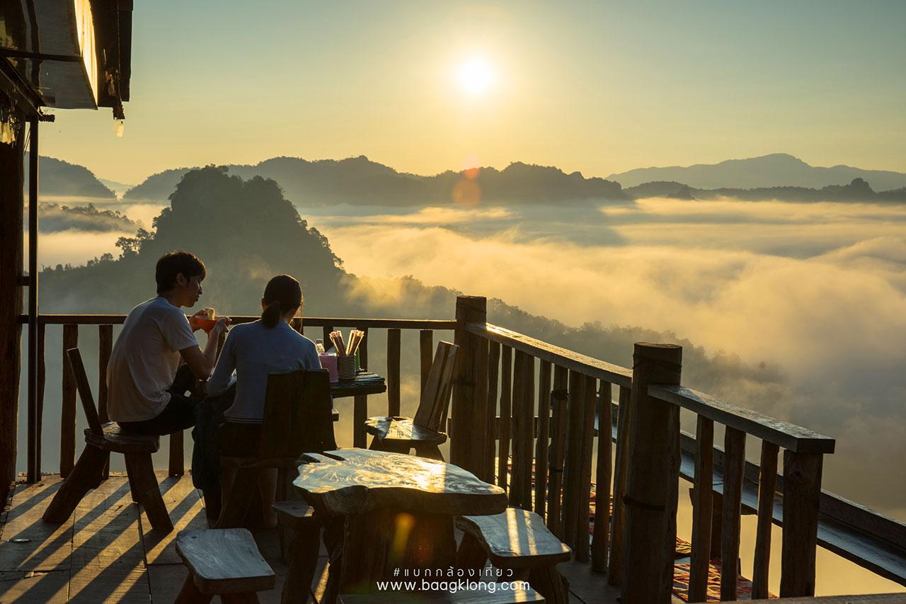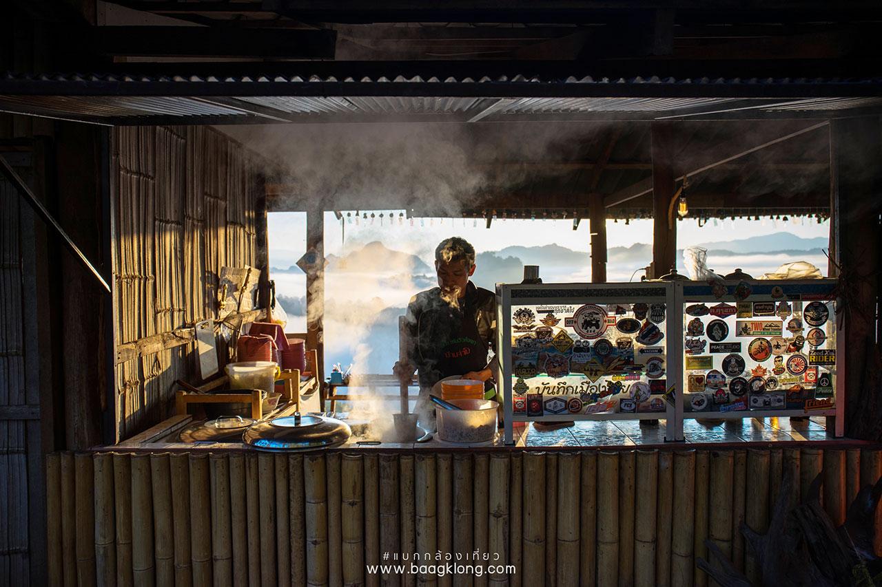ไฮไลต์ของที่นี่จะมีร้านก๋วยเตี๋ยวห้อยขา และร้านกาแฟขายอยู่บริเวณจุดชมวิว ถ้าจะบอกว่าที่นี่ขายอาหารหลักสิบ แต่วิวหลักล้าน นี่คงไม่ใช่คำพูดที่เกินจริงสำหรับที่นี่แน่นอน ร้านรวงต่างๆ เปิดรอรับนักท่องเที่ยวตั้งแต่ 06.00 น. กันเลยครับ วันนี้ผมได้ลองสั่งก๋วยเตี๋ยวต้มยำ รสชาติใช้ได้เลยครับ ราคาไม่แพงด้วย แค่ 35 บาท แต่วิวเมื่อเช้านี้ ตอนที่เราทานอาหารกันและกาแฟ นั่งชมพระอาทิตย์ค่อยๆ ขึ้น มาพร้อมกับสายหมอกไหลผ่าน มันเหนือคำบรรยายจริงๆ เลยครับ