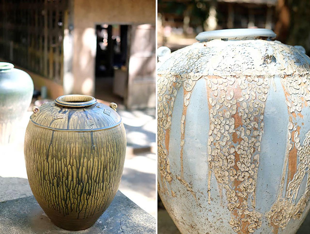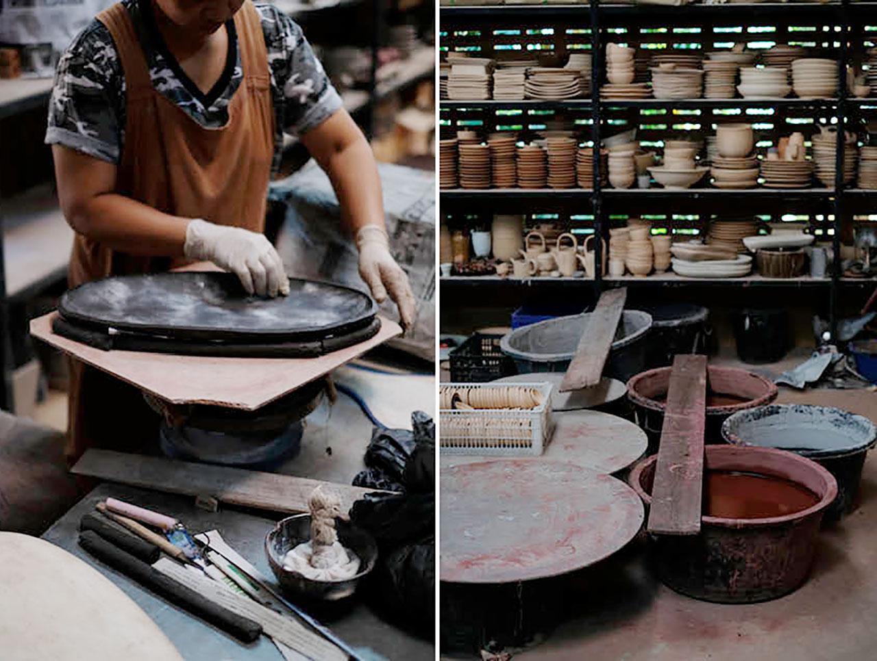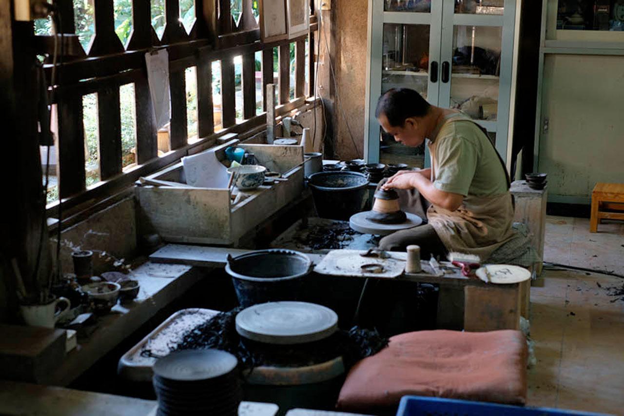 ใครมาที่นี่จะได้เห็นกระบวนการผลิตเครื่องปั้นดินเผาหลายรูปแบบอย่างใกล้ชิด และอย่างไม่มีพิธีรีตองใดๆ เลย เดินเข้ามาจะเจออาคารดินปูนสีสวยหลังเล็กหลายหลัง คุณเดินดุ่มเข้าไปได้หมดเลย มีทั้งแกลลอรี่โชว์ผลงานคลาสสิกและสำหรับจำหน่าย ถัดไปเป็นโรงเก็บงานที่ทำตามออร์เดอร์ หรืองานต้นแบบต่างๆ ถัดไปอีกจะได้ยินเสียงกึ่งกั้งๆ ดังเบาๆ ออกมาจากอาคารหลังในสุด ปรากฏว่าเป็นห้องสำหรับร่อนดินให้ละเอียด ซึ่งมีดินจากหลายแหล่งที่มา เพราะแต่ละแห่งให้สีไม่เหมือนกัน ถัดจากเครื่องร่อนดิน เดินวนออกมาเป็นโรงปั้นและโรงเผา ที่มีพนักงานของคุณสมลักษณ์ทำงานง่วนอยู่ ในลักษณะไม่ต่างจากศิลปินกำลังสร้างงาน เขาจะไม่ได้มาสนใจชี้ชวนคุณคุยหรืออธิบายใดๆ แต่ละคนจะทำงานของตัวเอง แต่ถ้าคุณอยากรู้อะไร ก็ถามได้เลย ทุกคนยินดีแลกเปลี่ยนความรู้อย่างมีไมตรี