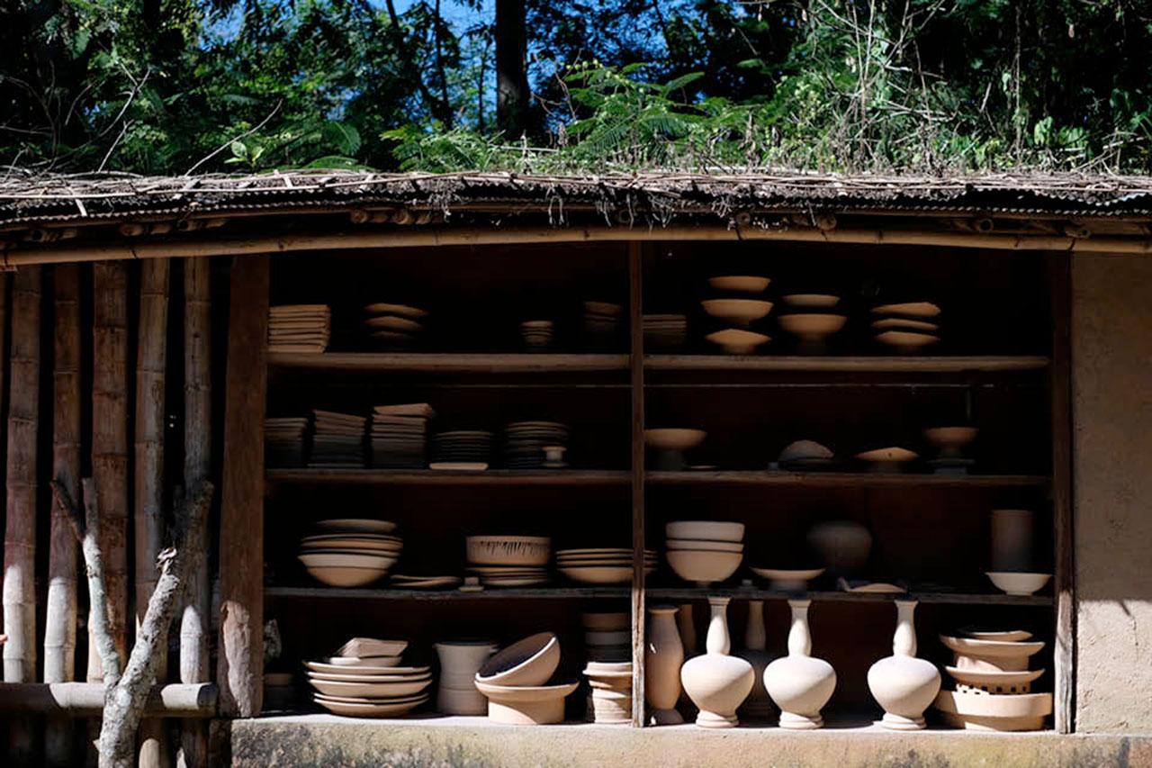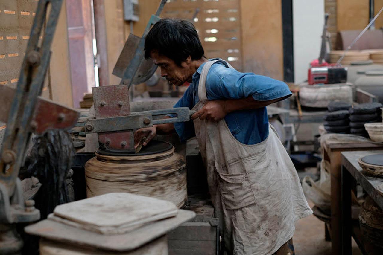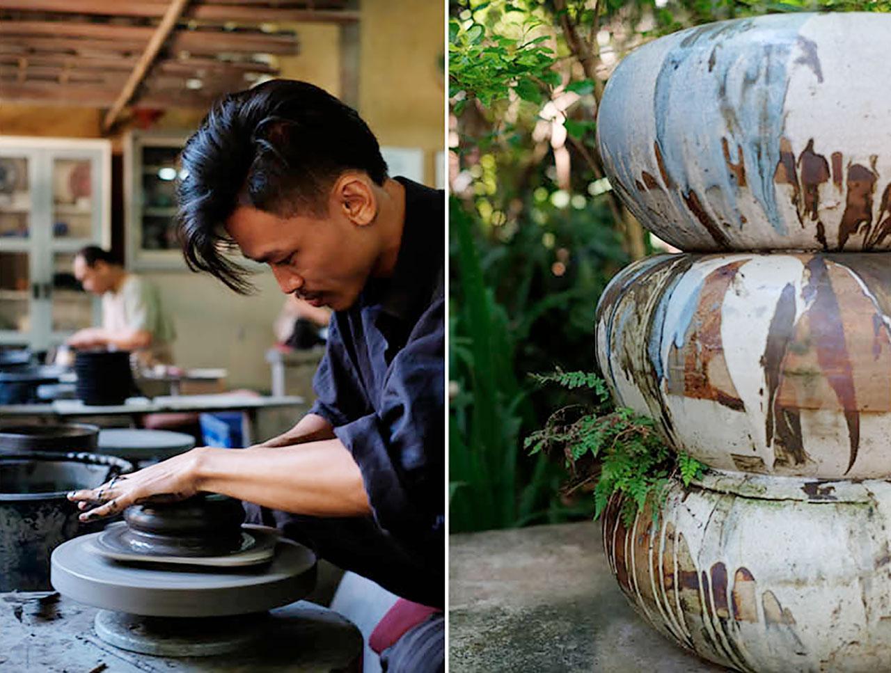 ใครมาที่นี่จะได้เห็นกระบวนการผลิตเครื่องปั้นดินเผาหลายรูปแบบอย่างใกล้ชิด และอย่างไม่มีพิธีรีตองใดๆ เลย เดินเข้ามาจะเจออาคารดินปูนสีสวยหลังเล็กหลายหลัง คุณเดินดุ่มเข้าไปได้หมดเลย มีทั้งแกลลอรี่โชว์ผลงานคลาสสิกและสำหรับจำหน่าย ถัดไปเป็นโรงเก็บงานที่ทำตามออร์เดอร์ หรืองานต้นแบบต่างๆ ถัดไปอีกจะได้ยินเสียงกึ่งกั้งๆ ดังเบาๆ ออกมาจากอาคารหลังในสุด ปรากฏว่าเป็นห้องสำหรับร่อนดินให้ละเอียด ซึ่งมีดินจากหลายแหล่งที่มา เพราะแต่ละแห่งให้สีไม่เหมือนกัน ถัดจากเครื่องร่อนดิน เดินวนออกมาเป็นโรงปั้นและโรงเผา ที่มีพนักงานของคุณสมลักษณ์ทำงานง่วนอยู่ ในลักษณะไม่ต่างจากศิลปินกำลังสร้างงาน เขาจะไม่ได้มาสนใจชี้ชวนคุณคุยหรืออธิบายใดๆ แต่ละคนจะทำงานของตัวเอง แต่ถ้าคุณอยากรู้อะไร ก็ถามได้เลย ทุกคนยินดีแลกเปลี่ยนความรู้อย่างมีไมตรี