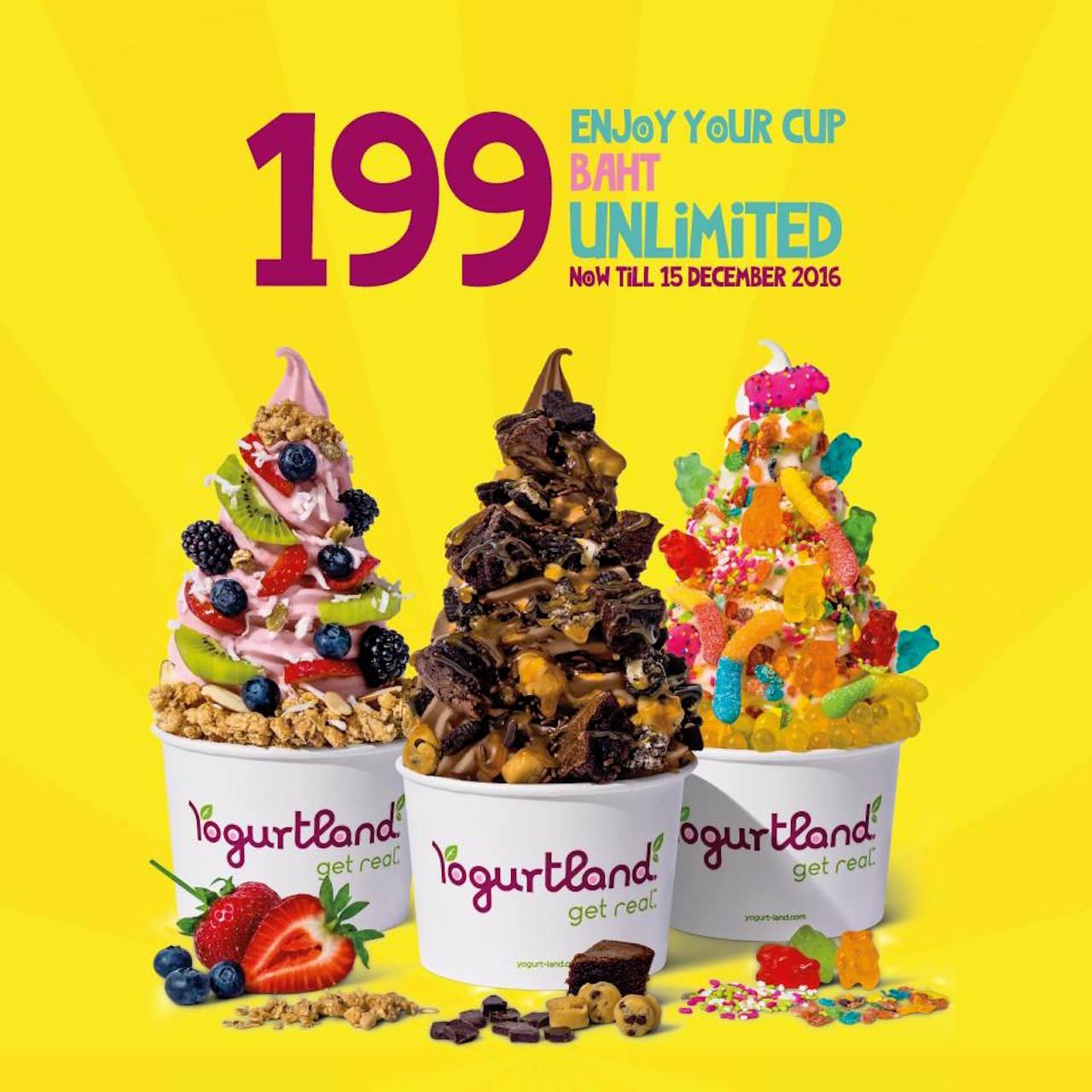 นอกจากนี้ ยังมีโยเกิร์ตและท็อปปิ้งแบบไม่อั้น ในราคาเพียง 199 บาท Unlimited โดยสามารถกดโยเกิร์ต และท็อปปิ้งใดก็ได้ ในราคา 199 บาท แบบไม่จำกัดปริมาณ ในขนาดเฉพาะถ้วยขนาด 8 ออนซ์เท่านั้น ไปชิมกันได้ที่โยเกิร์ตแลนด์ทุกสาขา (ยกเว้นสาขาเอ็มโพเรียม)