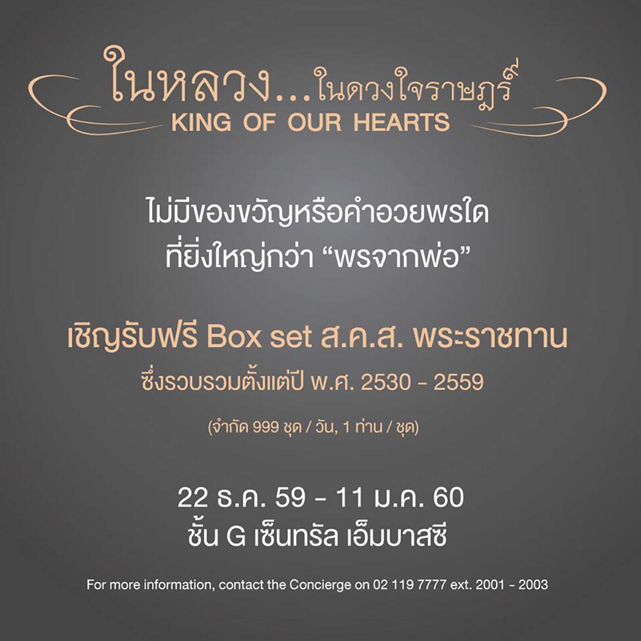พร้อมกันนี้ห้างฯ เซ็นทรัลได้จัดทำ ส.ค.ส. พระราชทานชุดพิเศษตั้งแต่ปี 2530-2559 ให้ผู้สนใจรับได้ฟรีโดยไม่มีค่าใช้จ่ายตลอดช่วงจัดแสดงนิทรรศการหมุนเวียนตอน พรภูมิพล ระหว่างวันที่ 22 ธ.ค. 2559-11 ม.ค. 2560 ผู้สนใจกรุณานำบัตรประชาชนหรือพาสปอร์ตมาลงทะเบียนรับเพื่อ ส.ค.ส. ได้ที่ ชั้น G มีจำกัดจำนวนต่อวัน