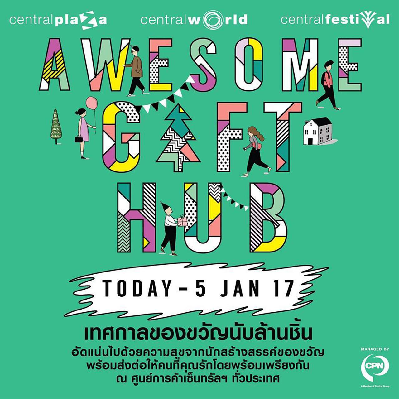 วันนี้ - 5 ม.ค. 2560 ชวนคุณมาเลือกหาของขวัญสุดพิเศษในงาน “Awesome Gift Hub” ณ ศูนย์การค้าเซ็นทรัลฯ ทั่วประเทศ พบกับปรากฏการณ์ความสุข และความมหัศจรรย์เทศกาลของขวัญที่มากที่สุด ดีที่สุด และใหญ่ที่สุด อัดแน่นไปด้วยความสุขจากนักสร้างสรรค์ของขวัญ พร้อมส่งต่อให้คนที่คุณรักโดยพร้อมเพรียงกัน มีทั้งของฝาก เครื่องประดับ เสื้อผ้า รองเท้า กระเป๋า ของแต่งบ้าน สินค้าความงาม สินค้าเพื่อสุขภาพ เป็นต้น