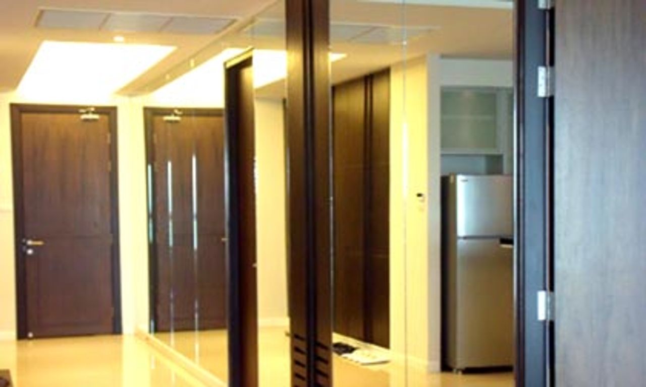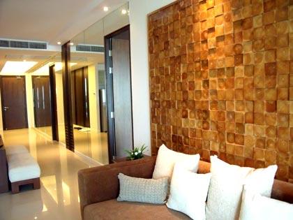 ความน่าสนใจของทางเข้าห้องนั้นอยู่ที่ไอเดียการออกแบบผนัง เพราะทางเข้านั้นเป็นพื้นที่แคบ เลยติดกระจกเงายาวถึงประตู จึงทำให้พื้นที่ดูกว้าง อีกทั้งยังสร้างบรรยากาศของห้องด้วยการเสริม Down Light ให้แสงนุ่มๆ เข้ากับบรรยากาศของธรรมชาติ ซึ่งมองเห็นจากระเบียงด้านหน้า