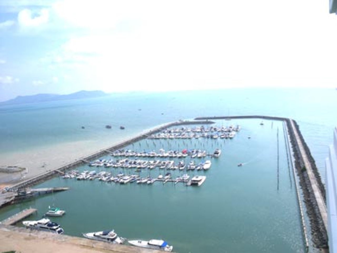 มุมมองจากตึกห้องพัก จะเห็นท่าจอดเรือออกแบบเป็นรูปเกือกม้าที่อยู่ท่ามกลางท้องทะเล