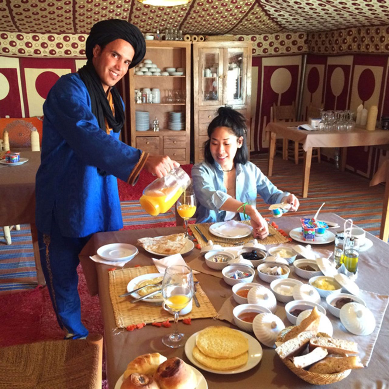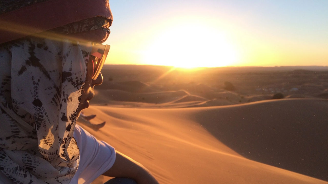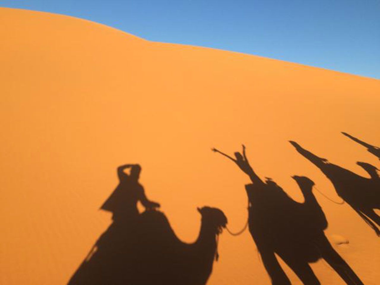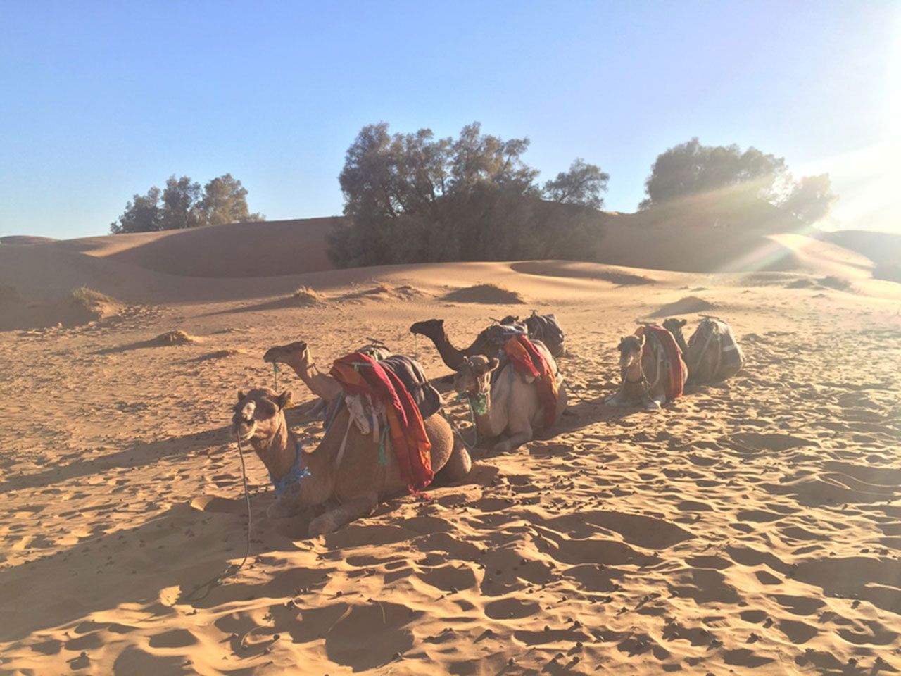 เราตั้งใจจะออกจากมาร์ราเกซไปทะเลทรายซาฮาร่าทันทีในตอนเช้า เพื่อไปให้ทันดูพระอาทิตย์ตกดินที่เอิร์กแชบบี (Erg Chebbi) ซึ่งเป็นส่วนที่อยู่ใกล้ที่สุดในอาณาเขตอันกว้างใหญ่ไพศาลของซาฮาร่า สิ่งที่น่าตื่นเต้น คือสองข้างทางที่เราต้องขับรถเกือบสิบชั่วโมง ผ่านเทือกเขาแอตลาส ผ่านคอวร์ซาเซต ผ่านโรสวาเลย์ ที่เป็นเหมือนลำธารเล็กๆ อยู่ระหว่างหุบเขา บางช่วงวิวเปลี่ยนเป็นแคนยอน บางช่วงเป็นทิวต้นปาล์ม ซึ่งเป็นโอเอซิสกลางทะเลทราย ทำให้เราเพลินกับการนั่งรถนานๆ มากกว่าจะเบื่อ เราไปถึงแคมป์ที่พักกันตอนเย็นที่อีกไม่นานพระอาทิตย์ก็จะตก ที่พักแบบเต็นท์ 15 หลังรอเรากลับมาทำกิจกรรมอื่นๆ หลังขี่อูฐท่องทะเลทรายเสร็จ