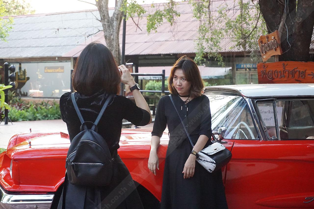 ถัดมาเป็นรถหรูโบราณวินเทจ สีแดงโดดเด่นสะดุดตา หลายคนเลยอยากไปต่อคิวแชะรูปคู่รถหรูคันนี้ซะหน่อย ซึ่งก็สวยงามเก๋ไก่ไปอีกแบบ