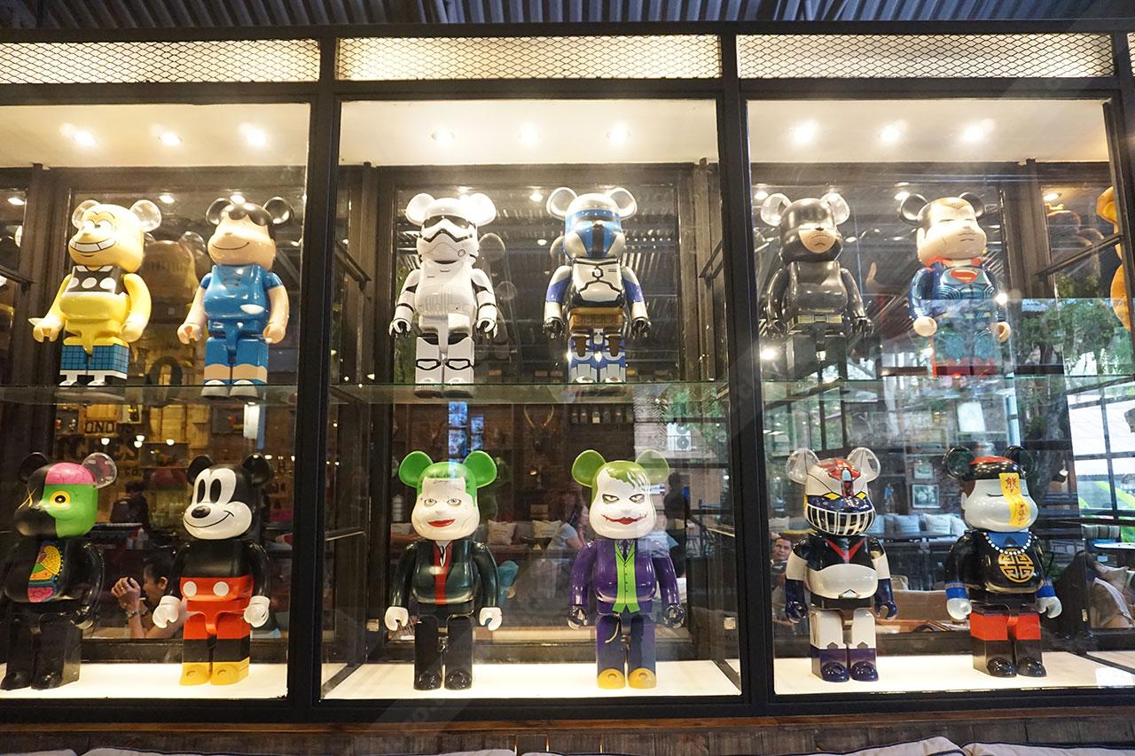 เดินเข้ามาลึกอีกนิด ก็จะเจอกับร้านกาแฟขนาดใหญ่ พื้นที่กว้างขวาง มีที่ที่นั่งให้เลือกหลายแบบหลากสไตล์ แต่ที่โดดเด่นสะดุดตาที่สุด ก็คงจะเป็นตู้กระจกขนาดใหญ่ที่จัดแสดงเจ้าหมี Bearbrick สุดหรูไว้เกือบ 20 ตัว ใครเป็นแฟนพันธุ์แท้แบร์บริค ห้ามพลาดมาชมและมาเก็บภาพสวยๆ กลับไปด้วยนะ