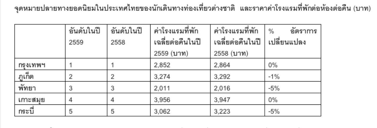 ในภาพรวมกล่าวโดยสรุปได้ว่า ประเทศไทยมีโรงแรม รีสอร์ต และที่พักมากมาย ที่เหมาะสำหรับการพักผ่อนริมชายหาด ซึ่งมีที่ตั้งอยู่ในเมืองจุดหมายปลายทางยอดนิยมทั้ง 5 อันดับดังกล่าว พร้อมมอบข้อเสนอราคาที่พักที่ดีที่สุดให้ด้วย แต่ละเมืองก็ต่างนำเสนอความคุ้มค่าด้านที่พัก ยกระดับข้อเสนอที่ดึงดูดใจมากยิ่งขึ้น ราคาค่าโรงแรมที่พักในกรุงเทพฯ และเกาะสมุยไม่มีการเปลี่ยนแปลง แต่นักเดินทางท่องเที่ยวจ่ายค่าโรงแรมที่พักในภูเก็ตลดลง 1 เปอร์เซ็นต์ ขณะที่ในพัทยาและกระบี่ จ่ายค่าที่พักลดลง 5 เปอร์เซ็นต์