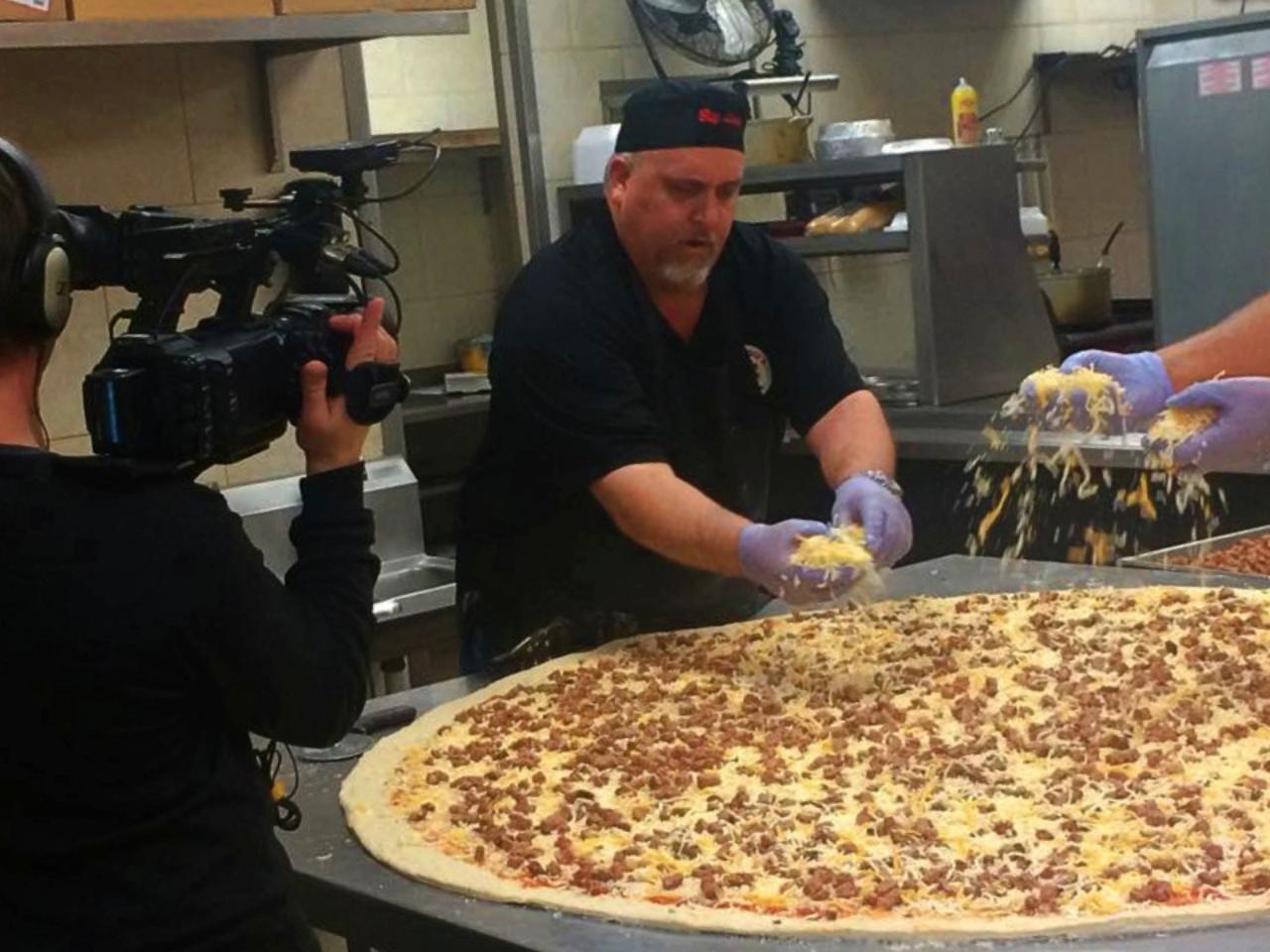3. พิซซ่าร้าน Big Lou ไซส์ 42 นิ้ว นี่คือขนาดของแป้งพิซซ่าก่อนอบนะจ๊ะ พออบจนสุกแล้วมันขยายขนาดขึ้นมาอีกตั้ง 3.5 ฟุต แน่ะ! ส่วนท็อปปิ้งที่โรยบนพิซซ่าต่างๆ ทั้งไส้กรอก เซลามี่ ไก่ ผัก พริกหวาน เห็ด และอื่นๆ รวมน้ำหนักประมาณ 27 ปอนด์ ซอสที่ใช้ก็ปรุงสดใหม่วันต่อวัน ส่วนชีสก็เป็นชีสมอสซาเรลล่าสดใหม่ ขูดสดๆ ทุกวัน เมนูเด็ดของร้านที่ทุกคนต้องสั่ง คือ พิซซ่าหน้าเปปเปอโรนี่ (Pepperoni)