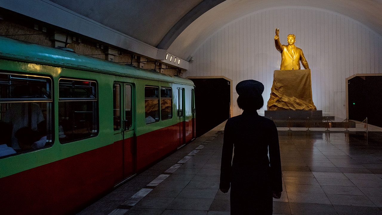 ที่สถานีรถไฟใต้ดินแห่งหนึ่งในกรุงเปียงยาง ผู้คุมรถไฟประจำสถานียืนอยู่หน้ารูปปั้นของ คิม อิลซุง ผู้นำคนแรกของเกาหลีเหนือ ผู้มีศักดิ์เป็นปู่ของคิม จองอุน ผู้นำคนปัจจุบัน