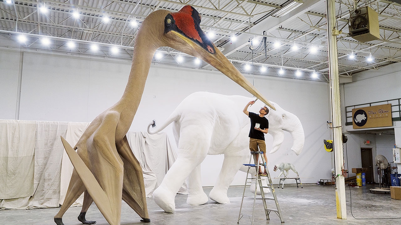 เคตซัลโคแอตลัส นอร์โทรพี ซึ่งสูงเกือบเท่ายีราฟ และมีระยะระหว่างปลายปีกสองข้างกว้างเท่าเครื่องบินขับไล่เอฟ-16 เป็นสัตว์บินได้ขนาดใหญ่ที่สุดชนิดหนึ่งตลอดกาล แบบจำลองขนาดเท่าตัวจริงซึ่งช่างกำลังระบายสีที่สตูดิโอในมินนิโซตานี้ มีจุดหมายปลายทางอยู่ที่ศูนย์วัฒนธรรมแห่งหนึ่งในคูเวต