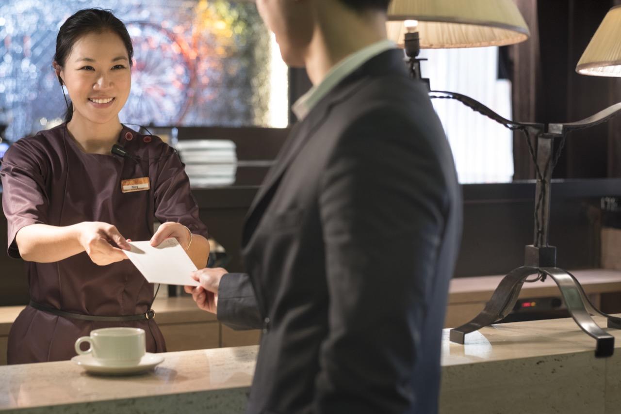 อีกด้านหนึ่งเป็นพื้นที่ต้อนรับ โดดเด่นด้วยพื้นหินสีเข้ม เพดานไม้ ผนังกระจกเคลือบ และเคาน์เตอร์หินสีอ่อน ซึ่งดีไซน์สอดรับกับคอนเซปต์ของโรงแรมที่ต้องการให้รู้สึกถึงความเรียบง่าย ไม่ซับซ้อน ด้วยบรรยากาศสงบและสุขุมนี้จะช่วยสร้างความรู้สึกผ่อนคลายให้กับผู้มาเยือน มีพนักงานต้อนรับคอยประจำที่ส่วนต้อนรับตลอด 24 ชั่วโมง เพื่อคอยรับผู้เข้าพัก ให้บริการข้อมูลท่องเที่ยว รวมทั้งเรียกรถรับส่ง และบริการอื่นๆ