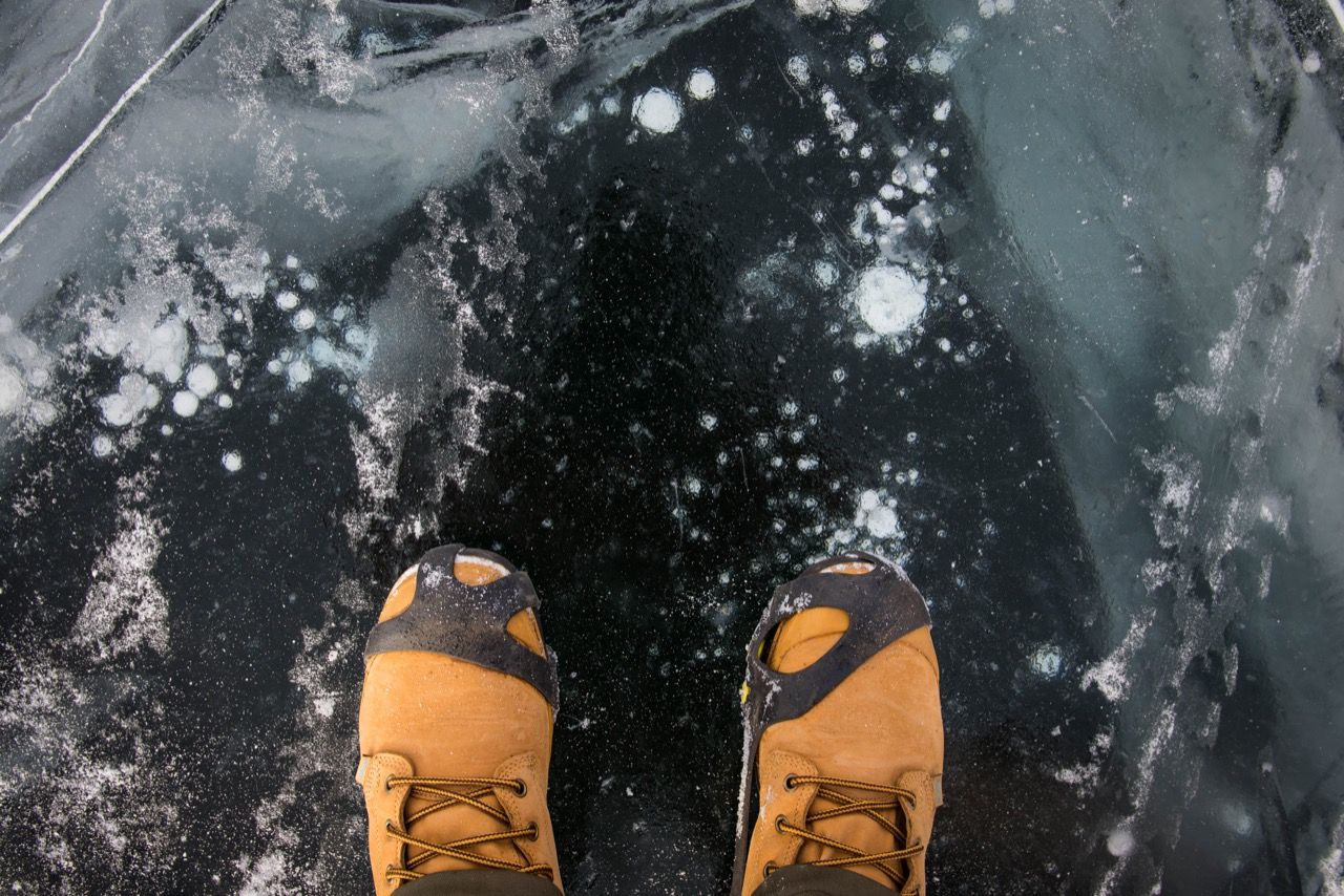 ถ้ำน้ำแข็ง อีกหนึ่งไฮไลต์สำคัญ บางจุดต้องเดินลุยแผ่นน้ำแข็งเข้าไป บางช่วงแผ่นน้ำแข็งอาจลื่นได้ บางจุดก็ต้องมีปีนป่ายกันบ้างเล็กน้อยด้วยทะเลสาบพื้นที่กว้างมาก ที่เที่ยวแต่ละจุดห่างกันหลายกิโล เลยก็มีการเดินทางจึงต้องใช้รถตู้วิ่งบนน้ำแข็งในทะเลสาบ ขับตามๆ กัน เวลาเบรกค่อนข้างลื่น จึงต้องเว้นระยะพอควร