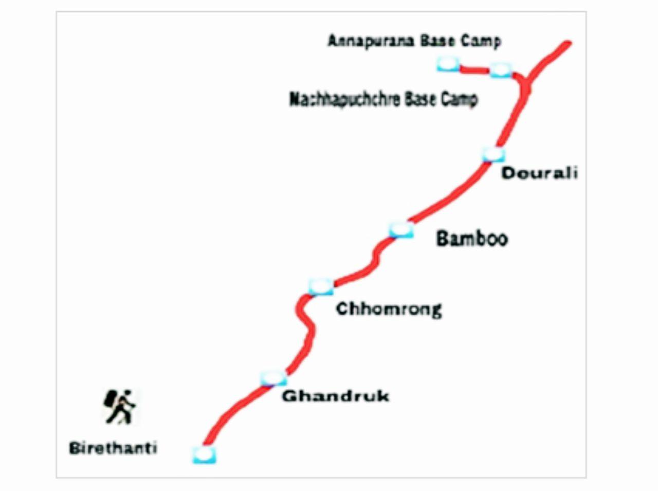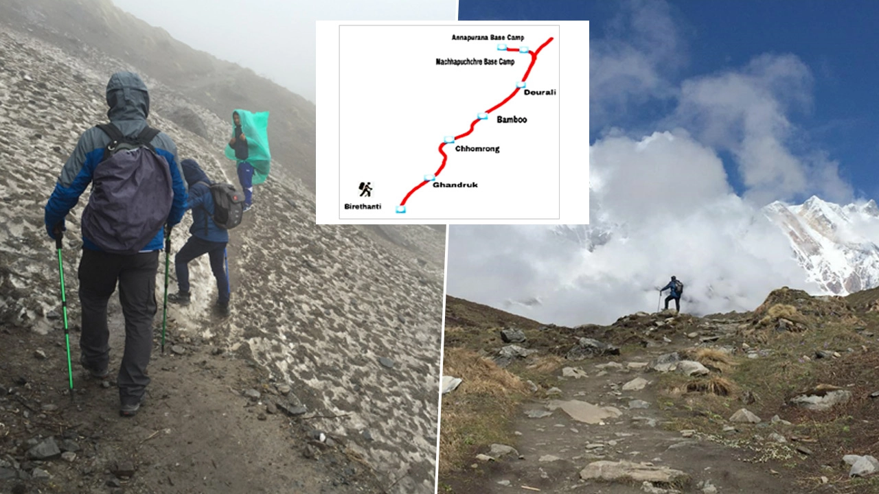 เราออกเดินทางจากท่าอากาศยานสุวรรณภูมิด้วยสายการบินไทยมุ่งหน้าไปยังเมืองกาฐมาณฑุ ประเทศเนปาล แล้วไปต่อเครื่องบินภายในประเทศ เพื่อไปพักค้างคืนที่เมืองโพคารา เช้าวันถัดมาเรานั่งรถยนต์เพื่อไปยังหมู่บ้านบิเรธันติ (Birethani) ซึ่งเป็นจุดเริ่มต้นของการเดินเขาในครั้งนี้ พวกเราใช้เวลาเดินทางกว่า 4 วัน ระหว่างเส้นทาง ต้องเจอกับอากาศที่แปรปรวน แดดร้อนจัด หนาวจัดและฝนตก แต่ในที่สุดพวกเราก็มาถึง มัจฉาปูชเรเบสแคมป์ (Machhapuchhre Base Camp) ที่ความสูง 3,800 เมตร