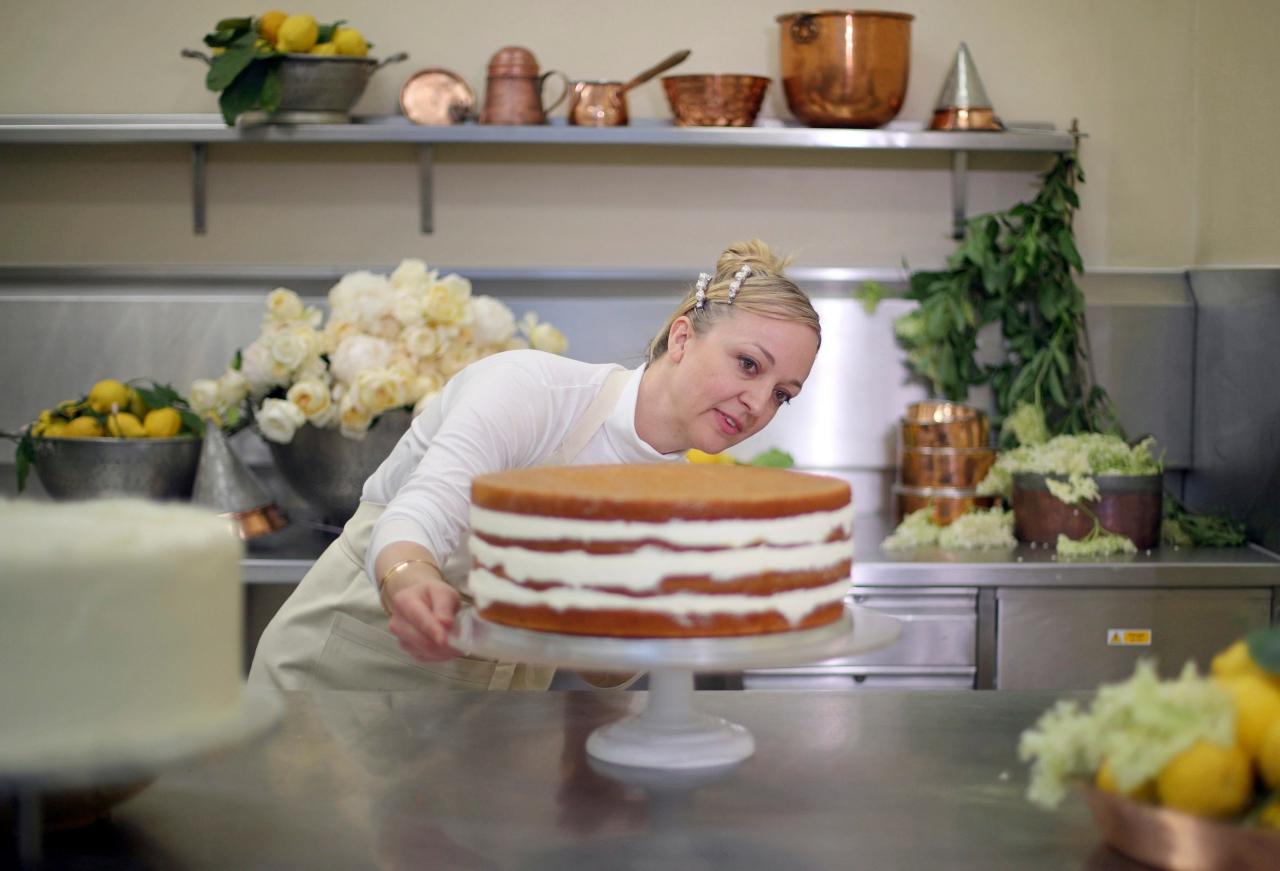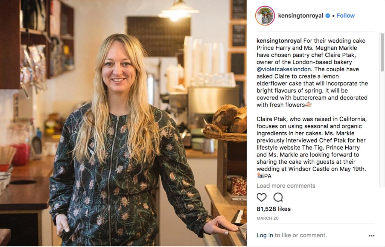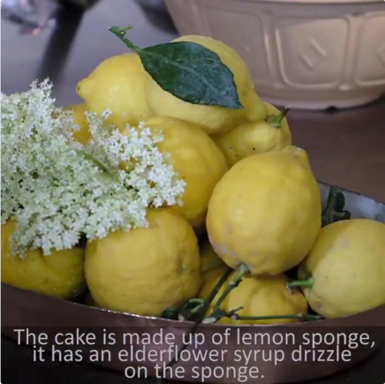 สำหรับพิธีเสกสมรสครั้งนี้ เชฟแคลร์จะทำเค้กรสชาติเปรี้ยวหวานอร่อย ตัวเค้กทำมาจากสปอนจ์เค้กรสมะนาว มีไซรัปที่ทำจากดอก Elderflower cordial (เป็นดอกไม้กินได้ นิยมทำเป็นน้ำเชื่อมที่มีกลิ่นหอมหวานละมุน) ราดลงบนเค้กมะนาว นอกจากนี้ก็จะมีชั้นเค้กเป็นครีมเคิร์ดเลมอน เพิ่มเติมความอร่อยด้วยสวีตเมอร์แรงก์ บัตเตอร์ครีม และใส่ไซรัปจากดอก Elderflower อีกที